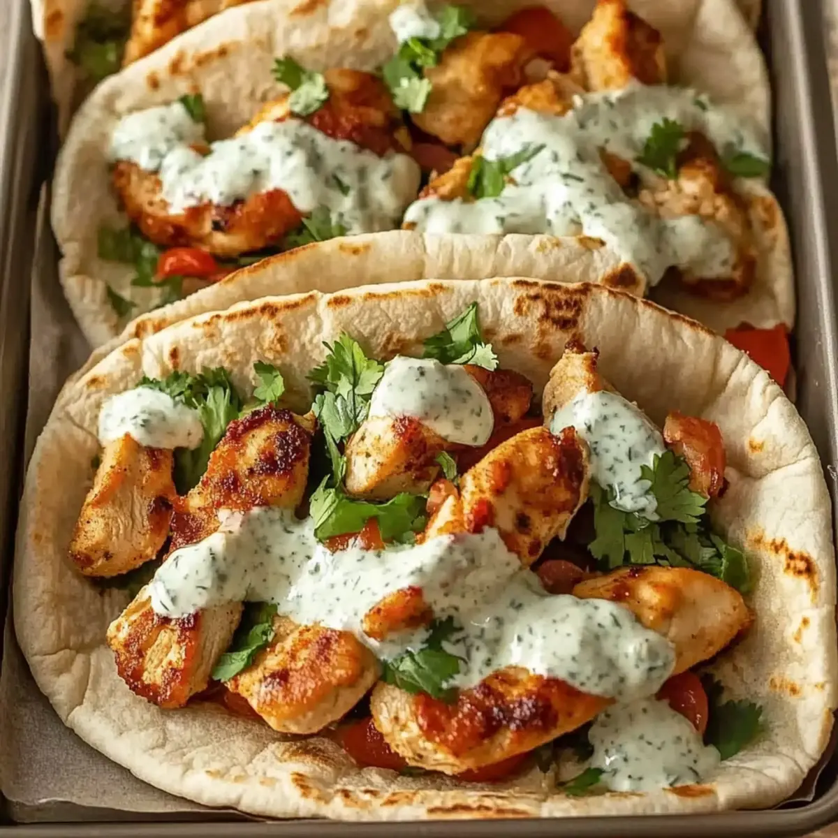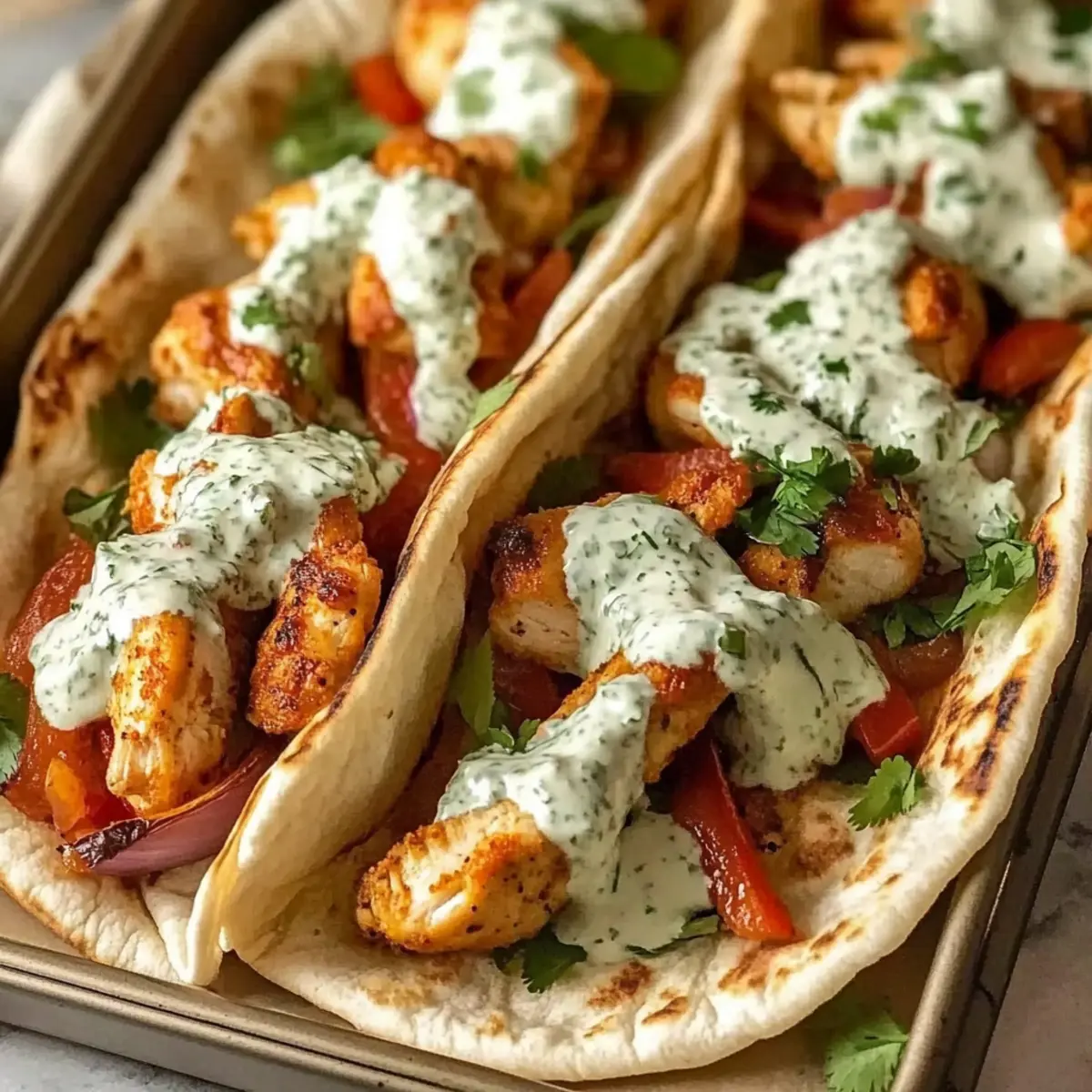 Facebook Twitter Pinterest LinkedInThe oven’s warm embrace filled my kitchen with the unmistakable aroma of roasting chicken and sweet peppers, instantly transporting me to sun-soaked Mediterranean coasts. Today, I’m sharing my go-to recipe for Sheet Pan Chicken Pitas with Herby Ranch, a delicious and easy weeknight dinner that satisfies even the busiest of schedules. Whipping this up takes just 45 minutes from prep to plate, allowing you to enjoy flavorful homemade cuisine without spending hours in the kitchen—perfect for meal prep aficionados! With the ability to customize your pitas—whether you prefer juicy chicken thighs, a tangy Greek yogurt ranch, or a unique spice blend—this dish is bound to please every palate around your table. Ready to dive into a culinary adventure that’s both nourishing and delightful? Let’s get cooking! Why are Sheet Pan Chicken Pitas a Must-Try? Simplicity: This recipe is incredibly easy, requiring minimal prep and just one pan, making cleanup a breeze after a bustling day. Fast: With only 45 minutes from start to finish, you can enjoy a wholesome meal without the hassle of extensive cooking time. Customizable: Tailor the flavors to fit your cravings! Switch out chicken for flavorsome thighs, or try a lighter Greek yogurt instead of mayo in your ranch. Healthy & Delicious: Packed with fresh veggies and lean protein, each bite not only satiates but nourishes your body, making it a guilt-free option for any weeknight. Crowd-Pleaser: It’s a dish everyone will love, turning even the pickiest eaters into fans. Add side dishes like a refreshing salad or roasted potatoes for a complete dinner experience. Check out our Chicken Sheet Pan for a delicious alternative! Sheet Pan Chicken Pitas Ingredients For the Chicken and Vegetables • Boneless, Skinless Chicken Breasts/Thighs – The main protein; thighs provide extra flavor and tenderness. • Red Bell Pepper – Adds sweetness and vibrant color to your dish. • Yellow Bell Pepper – Offers gentle sweetness and a beautiful pop of color. • Red Onion – Introduces savory depth and sweetness when roasted. • Olive Oil – Essential for tossing the chicken and veggies for optimal browning and flavor. • Garlic Powder – Infuses the dish with aromatic flavor; adjust to your taste. • Paprika – Adds a hint of smokiness; feel free to choose smoked or sweet. • Dried Oregano – Brings a touch of Mediterranean essence to your pitas. • Cumin – Adds warmth and complexity to your seasoning mix. • Chili Flakes – Adjust to spice preference for an extra kick. • Salt & Pepper – Essential for enhancing overall flavors; season to taste. For the Herby Ranch • Mayonnaise – Forms the creamy base; Greek yogurt offers a lighter alternative. • Sour Cream/Greek Yogurt – Provides a lovely tanginess; using only Greek yogurt makes it lighter. • Milk – Necessary to achieve that perfect ranch drizzling consistency. • Fresh Parsley, Dill, Chives – Fresh herbs brighten the ranch; dried versions can work in a pinch. • Lemon Juice/Vinegar – Adds acidity, balancing flavors for a delicious dip. For Assembly • Pitas – The fun, cozy base for all your fillings; warm them up to enhance flavor. • Shredded Lettuce/Mixed Greens – Adds a crunchy, fresh element to your pitas. • Tomato – Offers juiciness and freshness; slice just before assembly for the best taste. • Optional Toppings – Crumbled feta, pickled onions, cucumber, or hot sauce take your pitas to the next level. This Sheet Pan Chicken Pitas with Herby Ranch recipe is not only delightful but also fully customizable to fit your family’s tastes! Step‑by‑Step Instructions for Sheet Pan Chicken Pitas with Herby Ranch Step 1: Preheat the Oven Begin by preheating your oven to 425°F (220°C). This high temperature ensures the chicken and vegetables roast beautifully, developing that inviting aroma and a lovely caramelized flavor. While the oven heats up, gather your sheet pan and line it with parchment paper for easy cleanup later. Step 2: Prepare the Herby Ranch In a mixing bowl, whisk together mayonnaise, sour cream (or Greek yogurt), milk, fresh parsley, dill, chives, lemon juice, salt, and pepper until the mixture is creamy and smooth. Taste the herby ranch dressing and adjust seasoning if needed, then cover and chill it in the refrigerator to enhance the flavors while you prepare the rest of the ingredients. Step 3: Toss Chicken and Vegetables On a large sheet pan, combine sliced boneless, skinless chicken breasts (or thighs), red and yellow bell peppers, and red onion. Drizzle olive oil over the mixture and sprinkle with garlic powder, paprika, dried oregano, cumin, chili flakes, salt, and pepper. Toss everything together until evenly coated, ensuring the chicken and veggies are well seasoned for those scrumptious Sheet Pan Chicken Pitas. Step 4: Roast in the Oven Spread the seasoned chicken and vegetable mixture in a single, even layer on the sheet pan. Roast in your preheated oven for 20–25 minutes, flipping halfway through for even cooking. You’ll know it’s ready when the chicken reaches an internal temperature of 165°F (74°C), and the vegetables are tender with a hint of caramelization. Step 5: Warm Pitas While the chicken and veggies are roasting, prepare the pitas by warming them in the oven for the last 5 minutes of cooking. You can wrap them in foil or place them directly on the oven rack to get a bit softer and more flavorful. Warm pitas enhance the overall experience of your homemade Sheet Pan Chicken Pitas. Step 6: Assemble Your Pitas Once the chicken and vegetables are perfectly roasted, take the sheet pan out of the oven. Begin assembling your pitas by adding a layer of shredded lettuce, followed by a generous scoop of the chicken mixture. Top with fresh tomato slices, and don’t forget to drizzle over that delightful herby ranch for the perfect flavor boost that will impress everyone at the tab