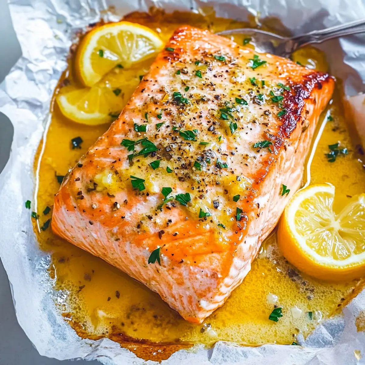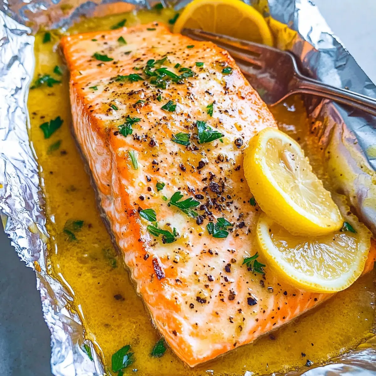 Facebook Twitter Pinterest LinkedInThe aroma hit me like a wave, a delightful blend of garlic and citrus that instantly made my mouth water. This 30-Minute Sheet Pan Lemon Garlic Butter Salmon recipe has become my go-to for impressing guests without spending hours in the kitchen. With its juicy, tender salmon, this dish brings together the perfect balance of zesty lemon and rich butter, creating an irresistible sauce that elevates even the simplest dinner. Plus, it’s an easy, high-protein meal that can be ready to serve in just half an hour—ideal for those busy weeknights or when a craving for something fresh strikes. Fancy a quick dinner that makes you feel like a gourmet chef? Let’s dive into this mouthwatering recipe! Why is sheet pan salmon so popular? Ease of Preparation: With just one pan and minimal prep, this recipe saves you time and cleanup. You’ll be thrilled at how quick it is to toss everything together! Flavor Explosion: The combination of garlic, lemon, and butter creates a heavenly sauce that you won’t want to miss—this dish is bursting with flavor! Healthy Eating Made Simple: High in protein and omega-3s, making it a nutritious choice without sacrificing taste. Pair it with a side salad or roasted veggies for a complete meal. Impressive Presentation: Serve right from the pan for a beautiful, family-style dinner that’s sure to wow your guests! You might want to check out my Chicken Sheet Pan for another effortless option! Customized to Your Taste: Feel free to mix and match ingredients like adding fresh herbs or swapping out the citrus—endless possibilities await! Sheet Pan Lemon Garlic Butter Salmon Ingredients For the Salmon • Skin-on Salmon Fillet – Adds moisture and flavor; skinless can be a substitute, though it loses some richness. • Lemon (sliced) – Freshness and zest that brightens the dish; remember, fresh lemons yield the best flavor! For the Sauce • Unsalted Butter – Creates a rich, luscious sauce; olive oil can be used for a dairy-free option. • Lemon Juice – Intensifies the lemon flavor; always opt for fresh-squeezed for brightness. • Honey – A touch of sweetness that caramelizes beautifully; try maple syrup if you prefer a vegan alternative. • Garlic (minced) – Provides an aromatic punch; be sure to mince finely for better flavor integration. Seasonings • Kosher Salt – Enhances the savory elements; feel free to adjust based on dietary needs, or use sea salt. • Black Pepper – Adds a subtle heat; fresh-ground pepper is recommended for the best flavor. Optional Garnish • Fresh Parsley – Adds a beautiful pop of color; feel free to skip if you want a simpler presentation. This Sheet Pan Lemon Garlic Butter Salmon is not only easy to pull together, but it’s also a delectable high-protein meal that’s set to impress any dinner guest! Step‑by‑Step Instructions for Sheet Pan Lemon Garlic Butter Salmon Step 1: Preheat the Oven Begin by preheating your oven to 375°F (190°C). This temperature is perfect for evenly cooking the salmon while allowing the butter to melt beautifully. While the oven warms up, line a sheet pan with aluminum foil for easy cleanup later and to keep your meal vibrant and juicy. Step 2: Prepare the Salmon Once the oven is ready, place the skin-on salmon fillet, skin-side down, in the center of your foil-lined pan. Gently pinch up the edges of the foil to create a small barrier around the salmon; this will help contain the delicious butter sauce as it cooks. Step 3: Add Lemon Slices Next, arrange fresh lemon slices around the salmon fillet on the sheet pan. These slices will infuse a bright, zesty flavor into the dish while visually enhancing the presentation. You’ll love the aromatic twist they provide as they cook alongside the salmon. Step 4: Make the Garlic Butter Sauce In a small microwave-safe bowl, melt about 4 tablespoons of unsalted butter. Once melted, stir in the freshly squeezed lemon juice, honey, and finely minced garlic to create a rich, flavorful sauce. Pour this luscious mixture evenly over the salmon and lemon slices, ensuring every bite is infused with that heavenly garlic butter flavor. Step 5: Season Generously Sprinkle kosher salt and freshly ground black pepper over the salmon and lemon to enhance the flavors of the dish. Taking a moment to season well is crucial—it brings out the delightful taste of the salmon and complements the tangy lemon. Step 6: Seal and Bake Now, take the edges of the foil and fold them tightly over the salmon to create a sealed packet. This will trap the steam and moisture, resulting in tender, perfectly cooked fish. Place the packed sheet pan in the preheated oven and bake for about 17 minutes, until the salmon is cooked through and flakes easily with a fork. Step 7: Optional Broil for Crispiness For an extra touch, after baking, you can remove the foil to uncover the salmon. Turn your oven to the broil setting and place the pan back in for 5–10 minutes to achieve a delightful crispy top. Keep a close eye during this step, as broiling can brown quickly! Step 8: Garnish and Serve Finally, once your Sheet Pan Lemon Garlic Butter Salmon is perfectly cooked and beautifully browned, carefully remove it from the oven. Garnish it with freshly chopped parsley for a pop of color. Serve hot, and enjoy the succulent flavors created by the garlic butter and zesty lemon! Make Ahead Options These Sheet Pan Lemon Garlic Butter Salmon are perfect for meal prep! You can marinate the salmon with the garlic butter sauce (butter melted with lemon juice, honey, and minced garlic) up to 24 hours in advance, allowing those flavors to seep in. For even more convenience, slice the lemons and store them in an airtight container in the fridge. To maintain quality, be sure to keep the salmon covered in the refrigerator, preventing it from drying out. When ready to bake, simply place the marinated salmon on the foil-lined sheet pan with the lemon slices, seal, an