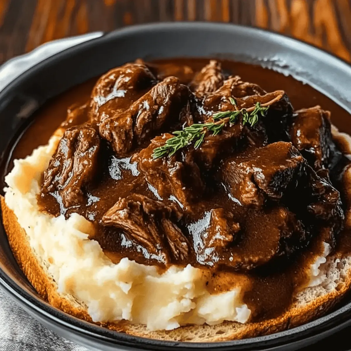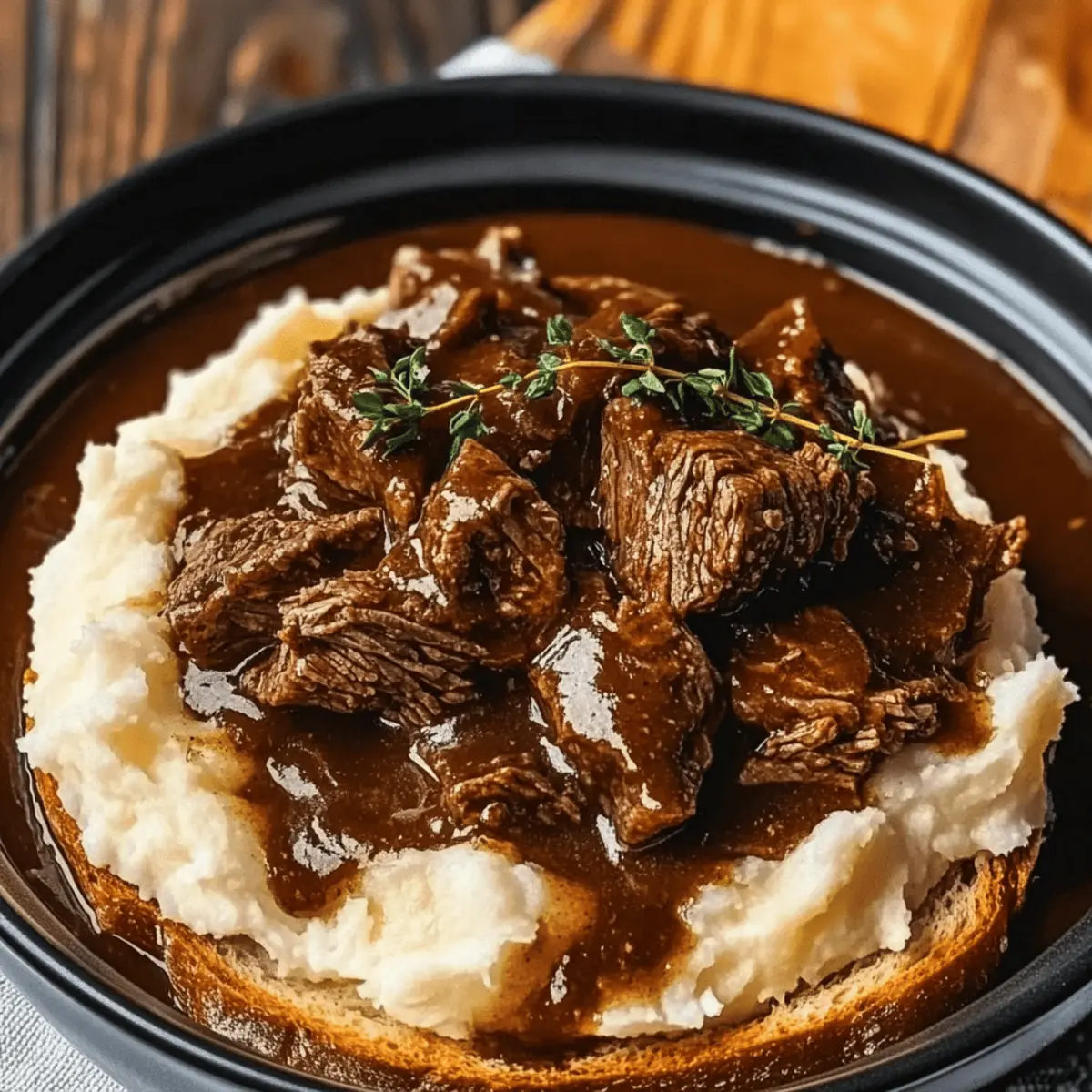 To assemble your Slow Cooker Beef Manhattan, start with a slice of soft white bread on each plate. Top it with creamy mashed potatoes, followed by a generous serving of the shredded beef. Finally, ladle the thickened gravy over the top for that ultimate comfort food experience.