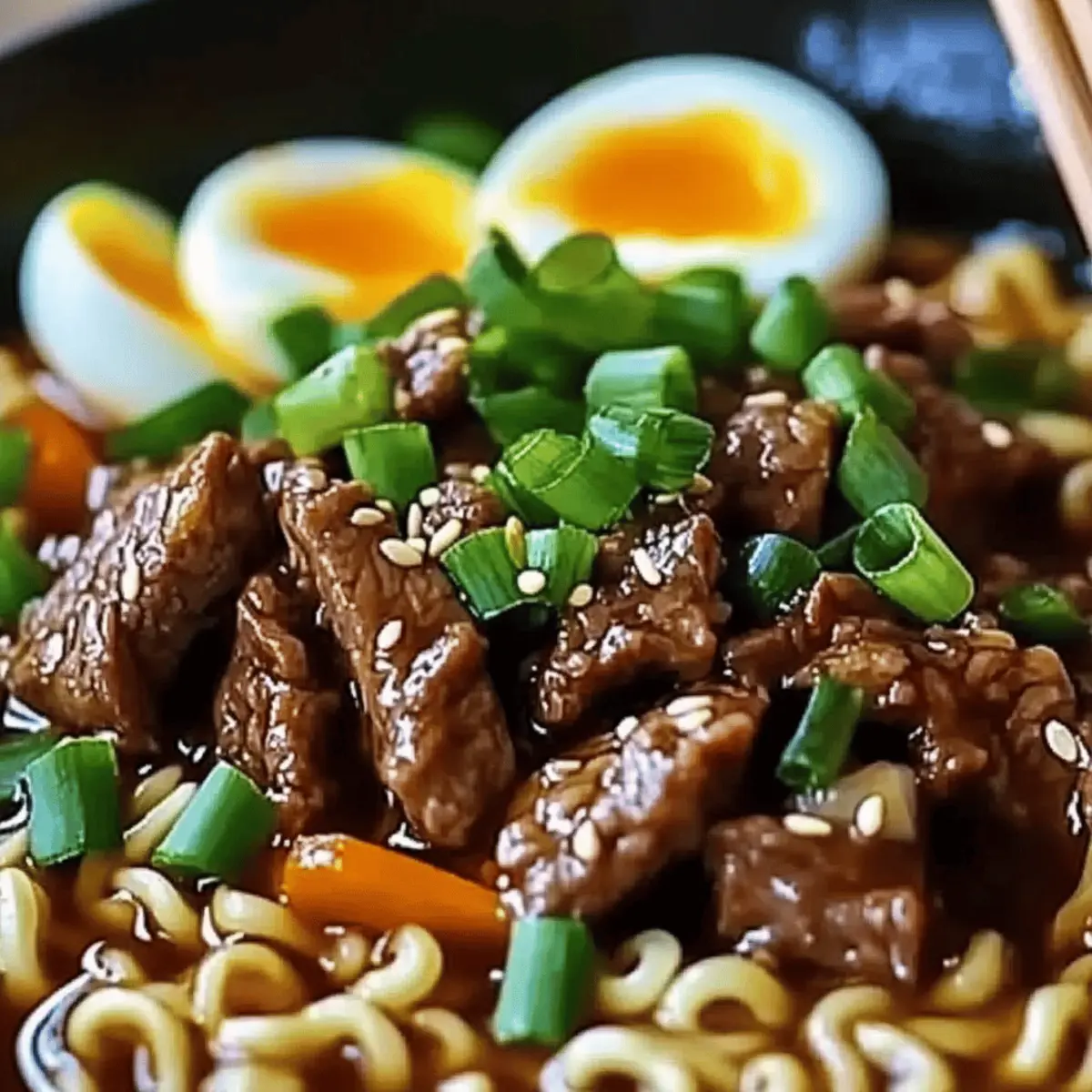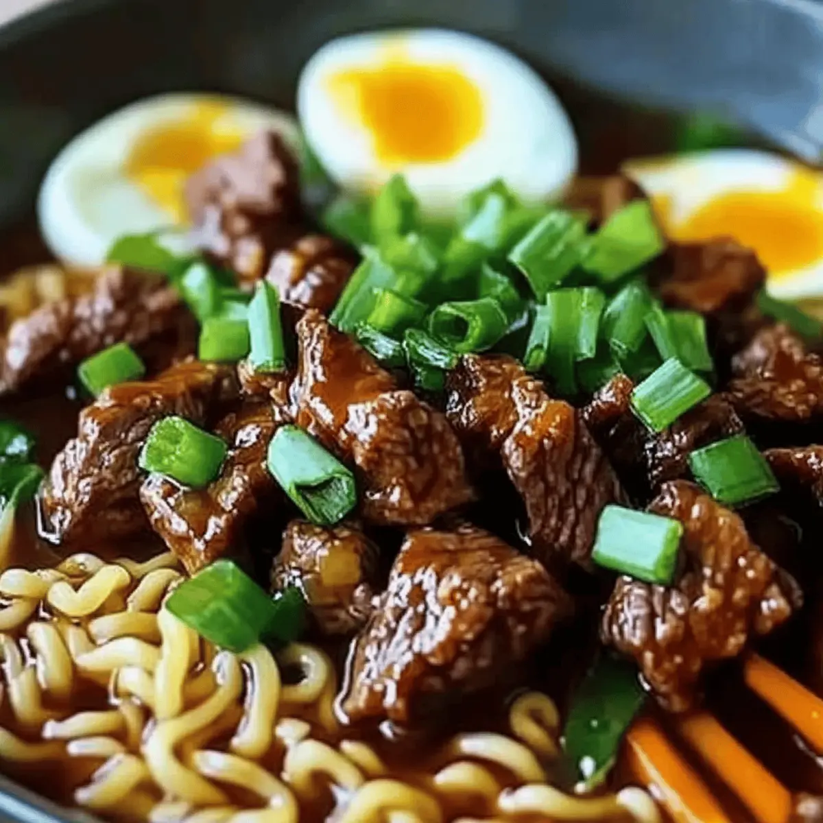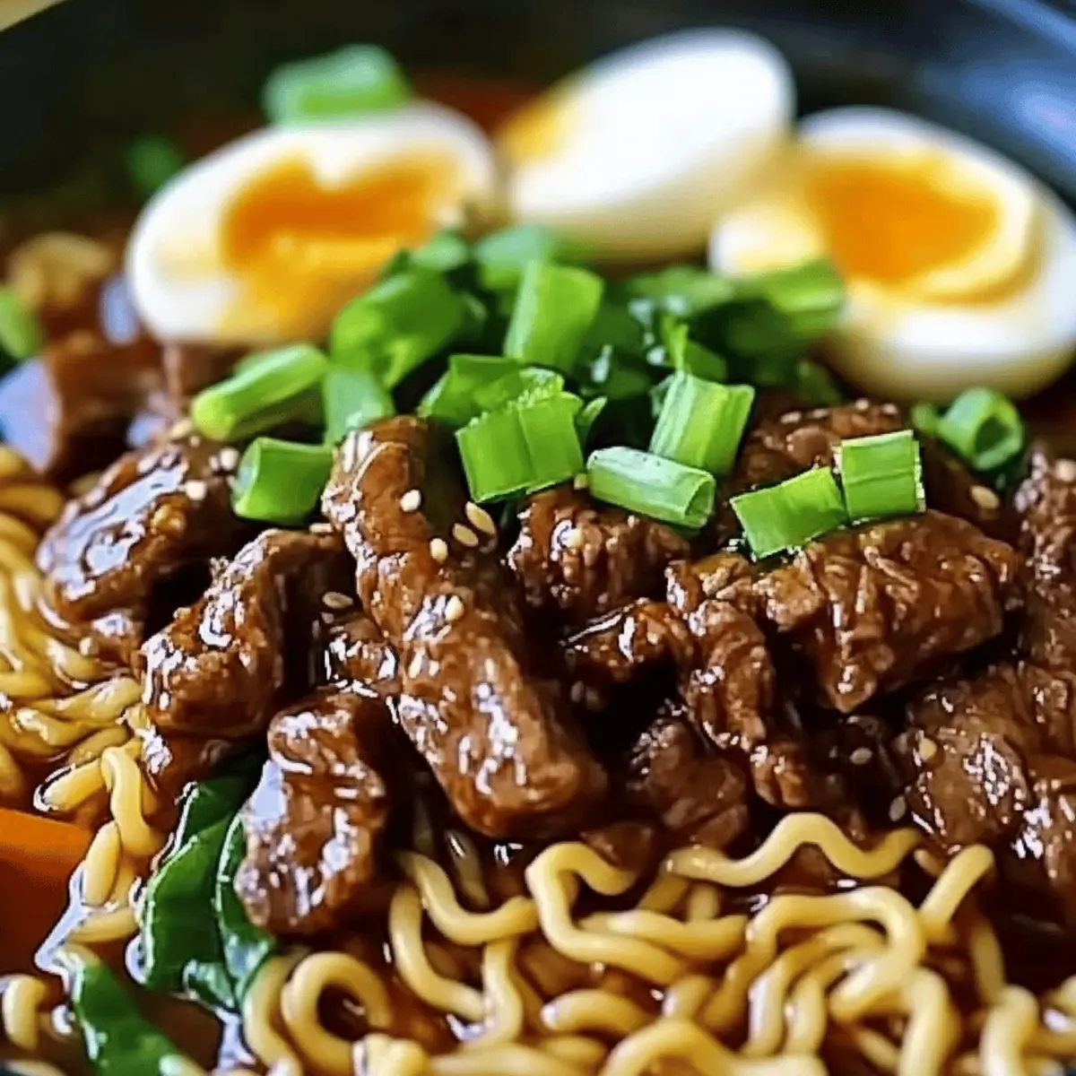 The first bite of Slow Cooker Beef Ramen Noodles transports me straight to cozy nights spent with family, wrapped in blankets, savoring the warmth of a lovingly prepared meal. This dish is the epitome of comfort food, combining succulent beef, a rich broth, and noodles that soak up all that savory goodness. Not only is this recipe a breeze to throw together, but it also caters to picky eaters, making it a sure-fire hit for everyone at the dinner table. Whether you’re seeking a simple weeknight solution or aiming to impress guests with a delightful homemade feast, this slow cooker wonder ticks all the boxes. Ready to transform your kitchen into a fragrant haven of mouthwatering aromas? Let’s dive into the heartwarming world of beef ramen! Why Choose Slow Cooker Beef Ramen Noodles? Comforting flavors meld seamlessly in this delightful dish, offering a hearty experience with every bite. Effortless preparation makes it a perfect choice for busy weeknights, simply set the slow cooker and relax! Customizable to satisfy every family member’s taste, add spicy elements or swap in fresh veggies for extra nutrition. Aromatic aromas drift through your home as it simmers, creating an inviting atmosphere for all. Whether enjoyed on a chilly evening or served at a casual gathering, these noodles are guaranteed to please all palates. Let’s make mealtime a cherished moment with this cozy recipe! Slow Cooker Beef Ramen Noodles Ingredients • Dive into the comforting world of Slow Cooker Beef Ramen Noodles with these nourishing ingredients to create a delightful dish the whole family will adore! For the Beef and Broth Beef Chuck Roast – Adds richness and hearty texture; can be substituted with brisket or short ribs for variation. Beef Broth – Provides the base of the savory liquid; homemade or quality store-bought enhances flavor immensely. Water – Balances the broth for desired richness; use to adjust consistency as needed. Garlic (4 cloves, minced) – Infuses aromatic depth; always use fresh garlic for the best outcome. Onion (1, sliced) – Introduces sweetness and flavor; shallots can be used for a milder taste. Ginger (1 tablespoon, grated) – Adds warmth and spice; fresh ginger is preferable for impact. Soy Sauce (1/4 cup) – Imparts umami and saltiness; swap with gluten-free soy sauce for dietary needs. Sesame Oil (2 tablespoons) – Elevates the dish with a nutty flavor; opt for toasted sesame oil for a deeper profile. Brown Sugar (2 tablespoons) – Balances the savory elements; maple syrup serves as a wonderful alternative. For the Noodles and Veggies Fresh Ramen Noodles (2 packs) – Cook quickly and soak up flavors beautifully; udon or rice noodles can be great alternatives. Baby Spinach (1 cup) – Not only adds nutrition but also a vibrant color; consider kale or bok choy for a twist. Optional Add-ins Green Onions (2, sliced for garnish) – Enhances presentation and freshness; add just before serving for best flavor. Soft-Boiled Eggs (optional) – Brings richness; can be omitted for a lighter dish. Sriracha or Chili Oil (optional) – Adds a spicy kick for those who crave heat; adjust to taste. Step‑by‑Step Instructions for Slow Cooker Beef Ramen Noodles Step 1: Prepare the Beef Begin by cutting the beef chuck roast into large chunks, then season generously with salt and pepper. This enhances the flavor of the meat and sets a delicious base for your Slow Cooker Beef Ramen Noodles. Ensure an even coating to get the most out of each bite. Step 2: Layer Ingredients In the slow cooker, layer the seasoned beef chunks at the bottom, followed by the sliced onion, minced garlic, and grated ginger. The aromatic combination will set the perfect foundation for the broth’s savory notes, ensuring that each component melds beautifully as it cooks. Step 3: Add Liquid Pour in the beef broth and water to the slow cooker, diluting the broth to your preferred richness level. Next, add the soy sauce, sesame oil, and brown sugar, stirring everything to combine well. This rich mixture will infuse flavor into the beef and noodles as they gently simmer. Step 4: Set Slow Cooker Cover your slow cooker and set it to cook on low for 8 hours or high for 4 hours. As it cooks, the beef will become tender, shredding easily with a fork. Keep the lid on during cooking to maintain moisture and let those flavorful aromas fill your home. Step 5: Prepare Noodles About 10 minutes before serving your Slow Cooker Beef Ramen Noodles, cook the fresh ramen noodles according to package instructions, usually around 4-5 minutes. Drain them in a colander when done, and set aside. These noodles will soak up the delicious broth and flavors beautifully. Step 6: Add Vegetables Just before you’re ready to serve, stir in the baby spinach into the slow cooker, allowing it to wilt in the hot broth for about 2-3 minutes. This step not only boosts the nutritional value but also adds a lovely pop of color to your comforting bowl of ramen. Step 7: Serve Ladle the tender beef and aromatic broth over the cooked noodles in individual bowls. This presentation showcases the succulent meat and rich broth, making your Slow Cooker Beef Ramen Noodles a visual and culinary delight that invites everyone to dig in. Step 8: Garnish Top each bowl with sliced green onions for a fresh finish. If desired, add a soft-boiled egg for added richness and drizzle with Sriracha or chili oil for those who enjoy a bit of heat. This final touch elevates your cozy meal, bringing balance to the savory flavors. Expert Tips for Slow Cooker Beef Ramen Noodles Fresh Ingredients: Use fresh garlic and ginger for vibrant flavor; dried alternatives will lack the same aromatic depth in your Slow Cooker Beef Ramen Noodles. Season to Taste: Adjust the amount of soy sauce based on your flavor preference; don’t hesitate to taste and tweak the broth during cooking. Miso Addition: For enhanced umami, consider stirring in a spoonful of miso paste right before servin