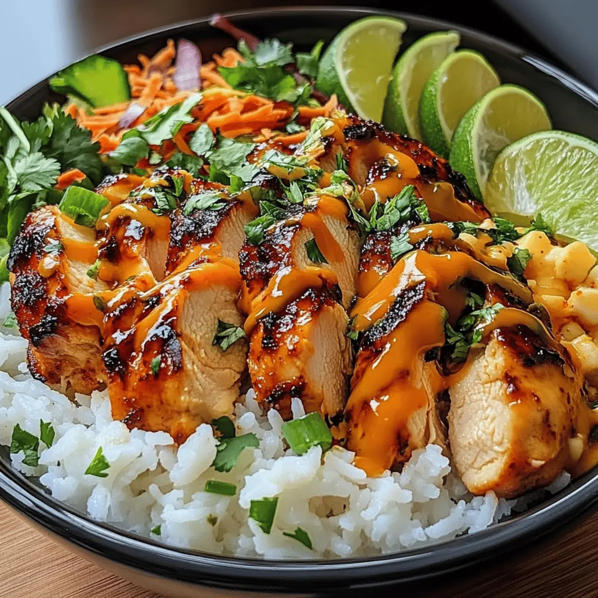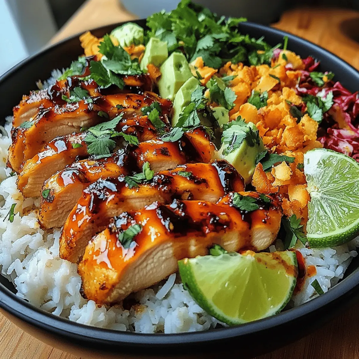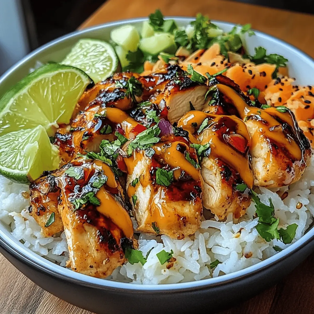 To assemble your dish, serve a generous portion of the fluffy coconut rice onto each plate or bowl. Slice the glazed spicy maple chicken and place it on top of the rice. Garnish with fresh cilantro, a wedge of lime, toasted coconut flakes, and sliced green onions for added flavor and a beautiful presentation. Enjoy your vibrant Spicy Maple Chicken and Coconut Rice!