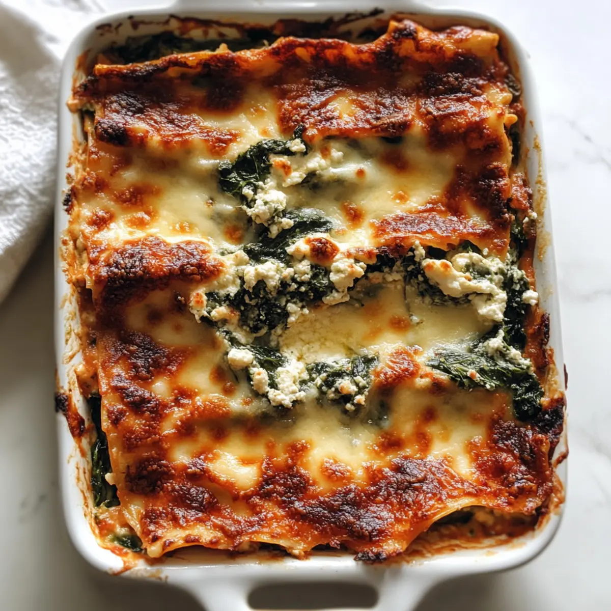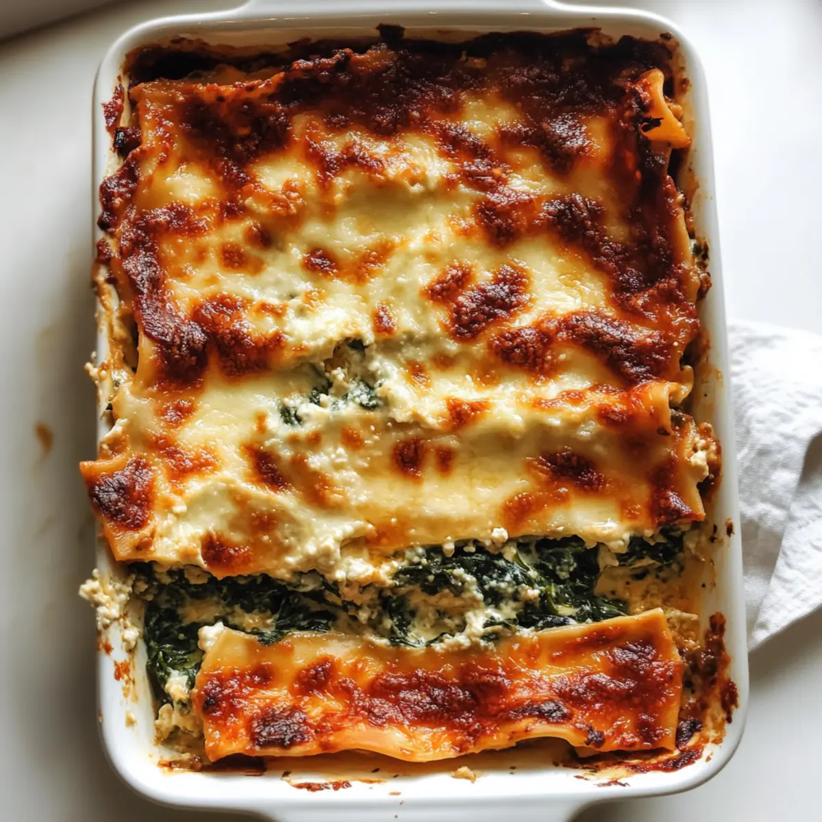 Facebook Twitter Pinterest LinkedInAs I pulled the Spinach Ricotta Lasagna from the oven, the aroma of warm marinara and gooey melted mozzarella wrapped around me like a cozy hug. This comforting vegetarian dish boasts layers of creamy ricotta and earthy spinach, creating a delightful experience with every forkful. Perfect for a family dinner or a cozy night in, this lasagna is not only a hearty meal but also a fabulous make-ahead option for busy weeknights. Plus, it’s a wonderful way to enjoy fresh, wholesome ingredients while keeping things simple. Curious about how to create this comforting delight that will have everyone asking for seconds? Let’s dive into the recipe! Why is Spinach Ricotta Lasagna a Must-Try? Comforting: The layers of creamy ricotta, melty mozzarella, and savory marinara come together to create a dish that feels like a warm hug. Make-Ahead Magic: This recipe is perfect for busy nights; simply assemble and refrigerate it for an easy weeknight dinner. Wholesome Ingredients: Packed with spinach, this lasagna is a fantastic way to sneak in nutritious veggies without sacrificing flavor. Versatile Delight: You can easily customize it with additional ingredients like fresh herbs or alternative cheeses to make it your own. Family-Friendly: It’s a hit with both kids and adults alike, meaning you’ll have the whole family sitting around the table, enjoying a hearty meal together. If you love comforting dishes, don’t forget to check out my Spinach Feta Quesadillas for another deliciously satisfying option! Spinach Ricotta Lasagna Ingredients • Here’s everything you need for a delightful Spinach Ricotta Lasagna! For the Lasagna Lasagna Sheets – Use fresh or no-boil sheets for added convenience. Frozen Spinach – Adds essential nutrients; fresh spinach can be sautéed and drained as a fresher alternative. For the Cheese Mixture Ricotta Cheese – The star ingredient, offering creaminess; cottage cheese is a great light substitute! Mozzarella Cheese – Melts beautifully, infusing richness; part-skim mozzarella works well for a lighter option. Parmesan Cheese – Sprinkle on top for a salty, nutty finish; Grana Padano can be a delicious alternative. For the Sauce Marinara Sauce – Ties the lasagna together with flavored layers; opt for a low-sugar brand for the best taste. For Seasoning Seasonings (Salt, Pepper, etc.) – Essential for enhancing flavors; fresh herbs like basil or oregano can be added for extra depth. Step‑by‑Step Instructions for Spinach Ricotta Lasagna Step 1: Preheat the Oven Begin by preheating your oven to 375°F (190°C). This step is crucial to ensure your Spinach Ricotta Lasagna cooks evenly. While waiting for the oven to reach the perfect temperature, you can prepare your ingredients, making the process smooth and efficient. Step 2: Prepare the Spinach-Ricotta Mixture In a mixing bowl, combine the ricotta cheese with thawed and well-drained spinach. Season the mixture generously with salt and pepper, then stir well until fully blended. This creamy filling will serve as the heart of your lasagna, so take care to achieve a nice, even consistency. Step 3: Layer the Marinara Sauce Spread a layer of marinara sauce evenly across the bottom of a baking dish. This base layer not only prevents the pasta from sticking but also infuses flavor into your Spinach Ricotta Lasagna. Use enough sauce to fully cover the bottom, creating a delicious foundation for your layers to come. Step 4: Begin Layering the Lasagna Place lasagna sheets directly on top of the marinara sauce, ensuring they don’t overlap. Then, spoon one portion of the ricotta-spinach mixture over the noodles, followed by a generous sprinkling of mozzarella cheese and a layer of marinara sauce. This beautiful layering will create a comforting combination of flavors. Step 5: Continue the Layering Process Repeat the layering process: add another layer of lasagna sheets, ricotta-spinach mixture, mozzarella, and marinara sauce. Continue this until all ingredients are used, making sure to end with a final layer of marinara sauce and a sprinkle of mozzarella on top. This structured approach ensures every bite is packed with flavor. Step 6: Bake the Lasagna Cover the assembled Spinach Ricotta Lasagna with aluminum foil, which prevents excessive browning. Bake in the preheated oven for about 30 minutes, allowing the flavors to meld beautifully. You’ll know it’s ready to uncover when the edges start to bubble invitingly. Step 7: Uncover and Brown the Cheese After 30 minutes, carefully remove the foil from the lasagna. Return it to the oven and bake for an additional 10 minutes, or until the cheese is bubbly and golden brown. The sight of that melted, toasty cheese will have everyone gathering around the oven in anticipation. Step 8: Cool and Slice Once out of the oven, let the Spinach Ricotta Lasagna cool for 10–15 minutes. This resting period allows the layers to set, making it easier to slice. As you cut into the lasagna, enjoy the delightful aroma and beautiful layers that will leave everyone eager to dig in. Make Ahead Options These Spinach Ricotta Lasagna make-ahead options are a lifesaver for busy weeknights! You can assemble the lasagna up to 24 hours in advance and refrigerate it before baking, ensuring all those delicious flavors meld together overnight. To maintain the quality, cover it tightly with foil to prevent drying out. Alternatively, you can freeze the assembled lasagna for up to 2 months; just remember to thaw it in the refrigerator overnight before baking. When ready to serve, simply preheat your oven and bake it according to the normal instructions, adjusting the cooking time if it’s starting from the freezer. Enjoy a homemade meal with minimal effort! What to Serve with Spinach Ricotta Lasagna This comforting dish pairs delightfully with a variety of sides that add flavor, texture, and freshness to your meal. Garlic Bread: The crispy edges and buttery garlic flavo
