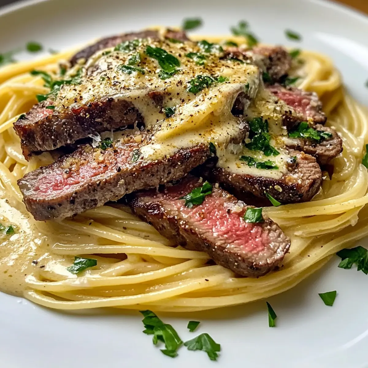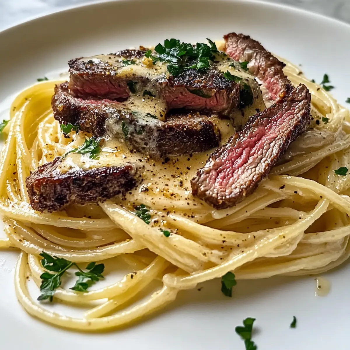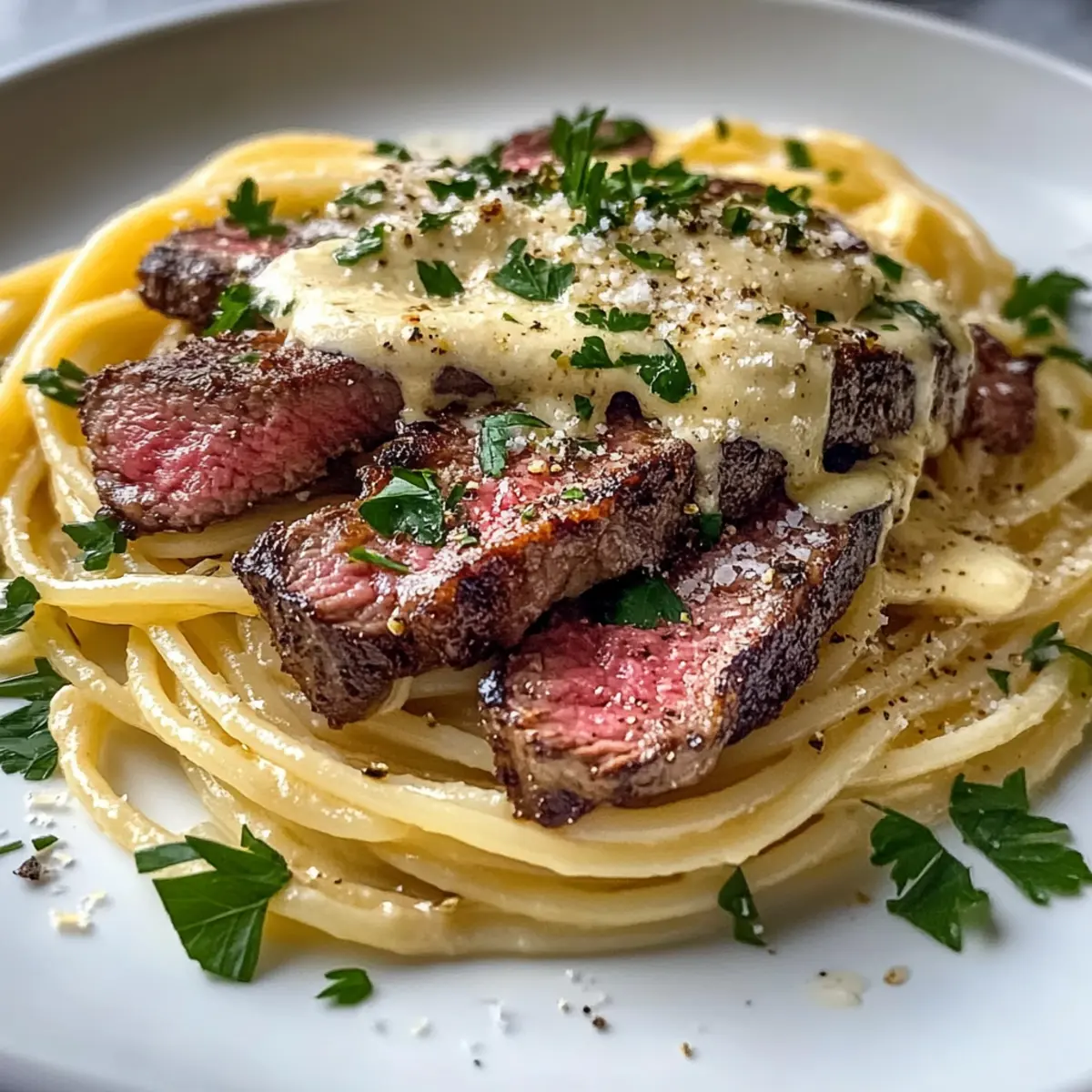 As I stood by the stove, the enticing aroma of roasted garlic wafted through the kitchen, instantly transporting me to a cozy Italian trattoria. This Steak & Roasted Garlic Alfredo Spaghetti is my go-to recipe for those evenings when comfort food is a must. Imagine twirling perfectly cooked spaghetti in a luxuriously creamy sauce, enriched with the sweet depth of roasted garlic and topped with tender, juicy steak. It comes together quickly and is ideal for both impressing guests on special occasions or indulging on a weeknight when you need a little extra love in your meal. With its blend of rich flavors and satisfying textures, it’s the ultimate solution to fast food fatigue. Who’s ready to elevate their dinner game? Why Is This Spaghetti So Irresistible? Comforting, Indulgent Dish: This Steak & Roasted Garlic Alfredo Spaghetti takes comfort food to a whole new level, satiating your cravings with its rich flavors. Quick & Easy: Perfect for busy weeknights, you can whip it up in under 30 minutes. Versatility at Its Finest: Substitute with chicken or add veggies to customize your meal. Satisfying Texture: The creamy Alfredo sauce clings beautifully to each strand of spaghetti, creating a mouthwatering experience. Perfect Pairings: Serve it alongside Cheesy Garlic Bread for a meal that feels like a special occasion, every night! Steak & Roasted Garlic Alfredo Spaghetti Ingredients For the Pasta • Spaghetti – The foundation of this dish; use gluten-free pasta for a gluten-free alternative. For the Steak • Steak – Beefy goodness from top sirloin or ribeye; flank or strip steak works too, just adjust cooking times! For the Sauce • Heavy Cream – Provides that luscious thickness; substitute with half-and-half for lighter fare but expect less creaminess. • Grated Parmesan Cheese – Adds nutty umami flavors; Pecorino Romano can be a sharp substitute. • Roasted Garlic – The secret weapon of flavor that sweetens beautifully when roasted; always opt for freshly roasted. • Olive Oil – Perfect for sautéing, giving an extra layer of richness; can switch to vegetable oil if needed. For Seasoning and Garnish • Salt and Pepper – Essentials that elevate flavors; adjust according to taste. • Fresh Parsley – A vibrant touch for garnishing that adds freshness and color to your plate. Unleash the deliciousness of this Steak & Roasted Garlic Alfredo Spaghetti and let it turn your kitchen into a cozy haven of comfort food bliss! Step‑by‑Step Instructions for Steak & Roasted Garlic Alfredo Spaghetti Step 1: Roast the Garlic Preheat your oven to 400°F (205°C). Take peeled garlic cloves and wrap them in aluminum foil, drizzling them with olive oil. Place the packet in the oven and roast for about 20 minutes, until the garlic is soft and golden. The sweet aroma will fill your kitchen, hinting at the delicious flavors to come in your Steak & Roasted Garlic Alfredo Spaghetti. Step 2: Cook the Spaghetti While the garlic is roasting, bring a large pot of salted water to a rolling boil. Once boiling, add the spaghetti and cook according to package instructions, usually around 8 to 10 minutes, until al dente. Drain the pasta and set aside reserving about a cup of pasta water to use later. This step is crucial for creating a creamy sauce that clings perfectly to the spaghetti. Step 3: Sear the Steak Pat the steak dry with paper towels and generously season both sides with salt and pepper. In a large skillet, heat a tablespoon of olive oil over medium-high heat until shimmering. Add the steak and sear for 4 to 5 minutes on each side until it reaches your desired doneness. Once cooked, transfer it to a cutting board and let it rest while you prepare the sauce, locking in those juicy flavors. Step 4: Make the Alfredo Sauce In the same skillet used for the steak, add a bit more olive oil if necessary and the roasted garlic—using a fork to mash it into a paste. Pour in the heavy cream, stirring to combine, and bring the mixture to a gentle simmer. Whisk in the grated Parmesan cheese, allowing it to melt into the cream, creating a smooth and luscious Alfredo sauce. Season with salt and pepper to taste. Step 5: Combine Pasta and Sauce Add the cooked spaghetti directly into the skillet with your creamy Alfredo sauce. Toss the pasta to ensure every strand is coated in that velvety sauce. If the sauce seems too thick, add a splash of the reserved pasta water until you achieve the perfect creamy texture for your Steak & Roasted Garlic Alfredo Spaghetti. Step 6: Slice the Steak and Serve Thinly slice the rested steak against the grain for maximum tenderness. Gently fold the steak slices into the pasta, allowing the flavors to unite. Serve the Steak & Roasted Garlic Alfredo Spaghetti immediately, garnished with fresh parsley for a pop of color and freshness. Enjoy your comforting meal that’s sure to be a family favorite! Make Ahead Options Preparing your Steak & Roasted Garlic Alfredo Spaghetti ahead of time is a fantastic way to save on busy weeknights! You can roast the garlic and prepare the steak up to 24 hours in advance, storing them in the refrigerator to maintain their flavors. Just roast your garlic, let it cool, and mash it before refrigerating. Similarly, sear your steak, let it rest, slice it thin, and store it tightly covered. When you’re ready to enjoy, simply cook the spaghetti, warm the Alfredo sauce in a skillet, and fold in the steak and roasted garlic. This way, you’ll enjoy a meal that is just as delicious and satisfying with minimal effort! What to Serve with Steak & Roasted Garlic Alfredo Spaghetti Enhance your dinner experience with delightful side dishes that perfectly harmonize with your creamy pasta creation. Garlic Bread: A classic favorite, it’s perfect for soaking up that luscious Alfredo sauce, making each bite a treat. Caesar Salad: Crisp romaine and tangy dressing provide a refreshing contrast to the rich pasta, balancing out the meal beautifully. Roast