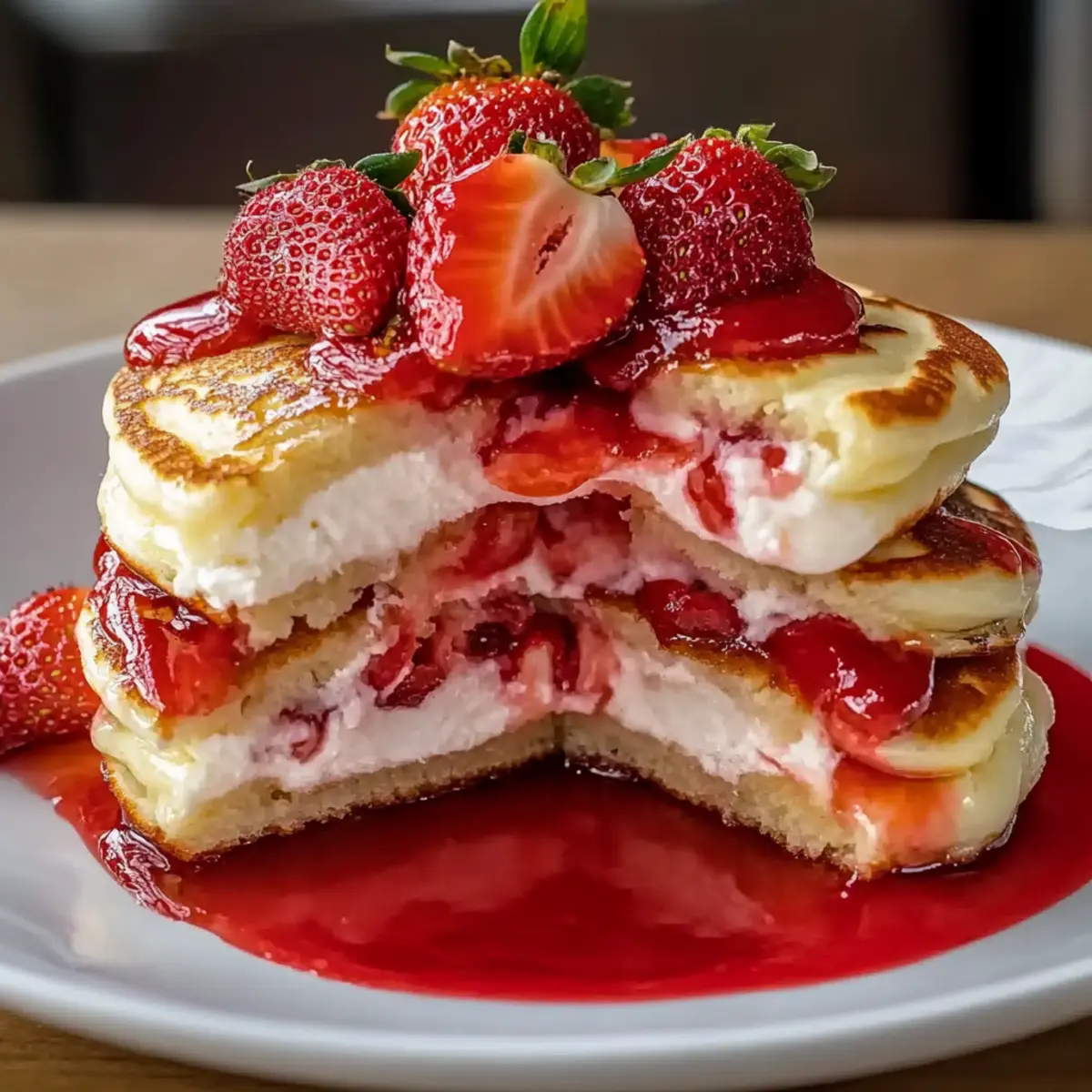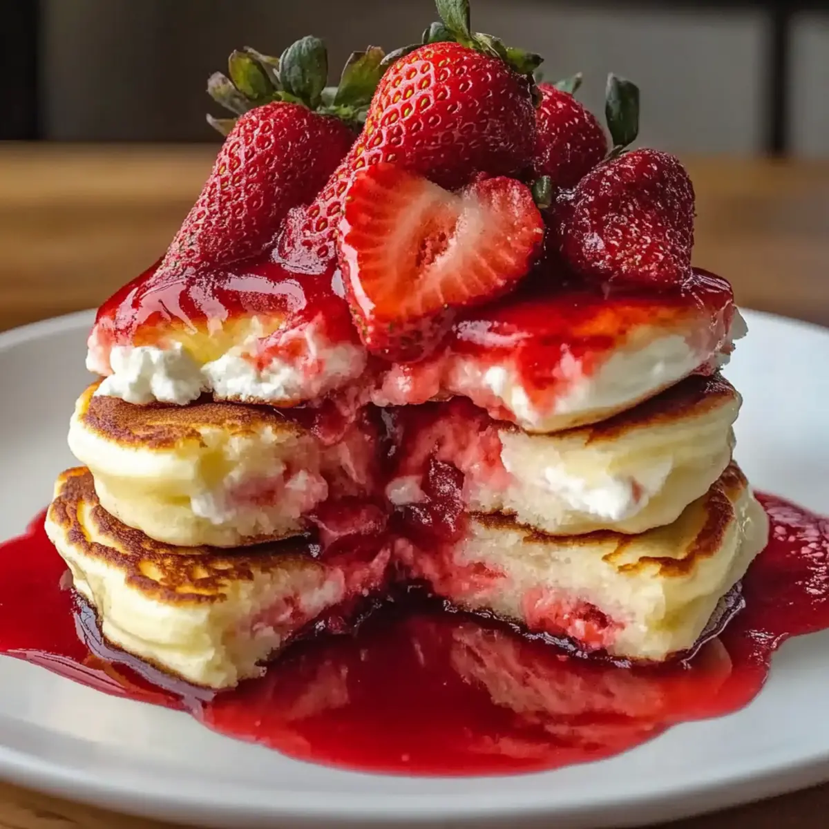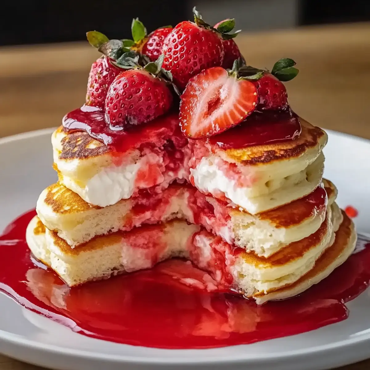 Facebook Twitter Pinterest LinkedInAs the sun peeks through the kitchen window, the enticing aroma of freshly cooked pancakes wafts through the air, enveloping me in a cozy embrace. This is the moment I live for, especially when it involves a stack of my indulgent Strawberry Cheesecake Pancakes. Combining warm, fluffy pancakes with a creamy cheesecake filling and topped with a luscious strawberry sauce, this recipe is a delightful twist on breakfast that’s as fun to make as it is to savor. Not only are they easy to whip up using basic pantry staples, but they also transform any weekend brunch into a special occasion. Whether you’re treating yourself or impressing loved ones, these pancakes promise a memorable start to the day. Ready to elevate your breakfast game? Let’s dive into this delicious journey together! Why are Strawberry Cheesecake Pancakes a must-try? Irresistible Delight: These pancakes bring the joy of cheesecake to breakfast, creating a truly special morning treat. Fluffy Texture: Each bite offers a perfect blend of airy pancakes and smooth cheesecake filling, making every mouthful a delight. Customizable Toppings: Whether you prefer classic strawberries or want to try blueberries or raspberries, the options are endless for topping these pancakes! Quick and Easy: Whipping up this recipe is a breeze, even on busy mornings, allowing you to enjoy a gourmet breakfast without the hassle. Crowd-Pleaser: Perfect for family brunch or entertaining guests, your Strawberry Cheesecake Pancakes are sure to impress everyone around the table. Looking for more delicious breakfast ideas? Check out my recipes for Fried Strawberry Cheesecake or Balsamic Strawberry Caprese to keep your mornings exciting! Strawberry Cheesecake Pancakes Ingredients • To create your perfect stack of Strawberry Cheesecake Pancakes, gather these essential ingredients. For the Pancakes All-Purpose Flour – Main structure for pancakes; a 1:1 gluten-free flour blend is a great substitute. Sugar – Adds sweetness; feel free to adjust or use a sugar alternative for your taste. Baking Powder – Provides essential leavening; ensure it’s fresh for the best fluffy texture. Salt – Enhances the overall flavor profile of the batter. Milk – Hydrates the pancakes; any milk (dairy or nut-based) works well. Egg – Binds ingredients and adds richness; for a vegan option, a flax egg is perfect. Butter – Contributes to richness and flavor; melted coconut oil can serve as a dairy-free option. Vanilla Extract – Enhances and deepens the flavor; opt for pure vanilla when possible. For the Cheesecake Filling Cream Cheese – The cornerstone of the cheesecake filling; ensure it’s softened for easy mixing. Powdered Sugar – Sweetens the filling; a sugar alternative can be used here too. For the Strawberry Sauce Fresh Strawberries – Ideal for topping; substitute with any berries you enjoy. Lemon Juice – Brightens and balances the sweetness of the strawberry sauce. Optional Garnishes Whipped Cream – Adds an extra indulgent touch; perfect for serving on top of your pancakes! Gather these key ingredients, and get ready to delight your taste buds with a breakfast that feels special! Step‑by‑Step Instructions for Strawberry Cheesecake Pancakes Step 1: Prepare Strawberry Sauce In a medium saucepan over medium heat, combine roughly chopped fresh strawberries, sugar, and a splash of lemon juice. Stir gently while the mixture simmers for about 6-8 minutes, allowing the strawberries to soften and break down. Once syrupy and slightly mashed, remove the saucepan from heat and let the strawberry sauce cool while you prepare the rest of the pancake ingredients. Step 2: Mix Pancake Batter In a large mixing bowl, whisk together the all-purpose flour, sugar, baking powder, and salt until well combined. In a separate bowl, whisk together the milk, egg, melted butter, and vanilla extract until the mixture is smooth. Carefully pour the wet ingredients into the dry mixture, stirring gently until just combined—take care not to over-mix! Let the batter sit for 5 minutes to thicken while you prep the cheesecake filling. Step 3: Make Cheesecake Filling In a small mixing bowl, use a hand mixer to beat the softened cream cheese until it’s creamy and smooth, about 1-2 minutes. Gradually add in the powdered sugar and a splash of milk, continuing to blend until the filling is silky and free of lumps. This delicious cheesecake filling will add a delightful layer between your pancake stacks! Step 4: Cook Pancakes Preheat a non-stick skillet or griddle over medium heat, lightly greasing it with a small amount of oil or butter. Once hot, pour ¼ cup of pancake batter onto the skillet for each pancake. Cook until bubbles form on the surface and the edges appear set, about 2-3 minutes. Flip the pancakes and cook until both sides are golden brown, around 1-2 minutes more. Repeat until all the batter is used, keeping the cooked pancakes warm on a plate. Step 5: Assemble Pancakes Now it’s time to stack your Strawberry Cheesecake Pancakes! Start with one pancake on a plate, and generously spread a layer of cheesecake filling on top. Continue stacking pancakes, alternating layers of filling until you’ve created a delightful tower. Drizzle the warm strawberry sauce over the top and add optional garnishes like whipped cream or graham cracker crumbs for an indulgent touch. Step 6: Serve Immediately Once assembled, serve your Strawberry Cheesecake Pancakes right away for the best experience. Let the fluffy pancakes, creamy filling, and sweet strawberry sauce create a mouthwatering moment as you savor each bite. Enjoy this extraordinary breakfast that’s sure to bring joy to your table! Storage Tips for Strawberry Cheesecake Pancakes Room Temperature: Enjoy your pancakes fresh off the skillet for the best experience; however, if you must store them at room temperature, keep them covered for no more than 1–2 hours. Fridge: Store any leftover 