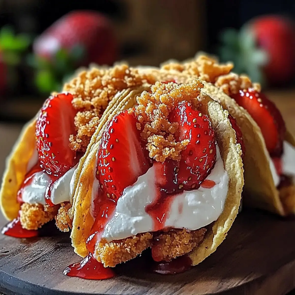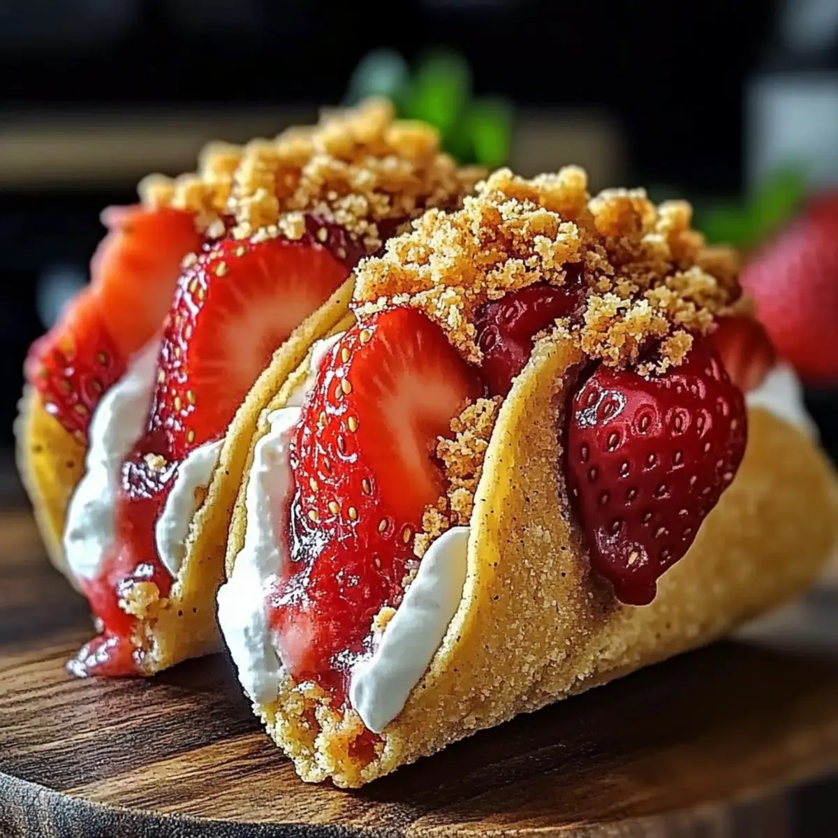 It was a sunny afternoon when I found myself staring at unassuming tortillas, wondering just how I could transform them into something extraordinary. Enter Strawberry Crunch Cheesecake Tacos, a fun dessert that brings a playful twist to two beloved favorites. These tantalizing delights take mere minutes to whip up and require no baking, making them a perfect addition to impromptu gatherings or cozy weeknight indulgences. Imagine crispy taco shells cradling a luscious cheesecake filling, all brightened with fresh strawberries and a sprinkle of crunchy cookie crumbs! What’s great is you can easily customize this recipe to fit your preferences—swap in different fruits or experiment with various cookies to create your own unique spin. Are you ready to take your dessert game to the next level? Let’s dive into this fun-filled adventure!