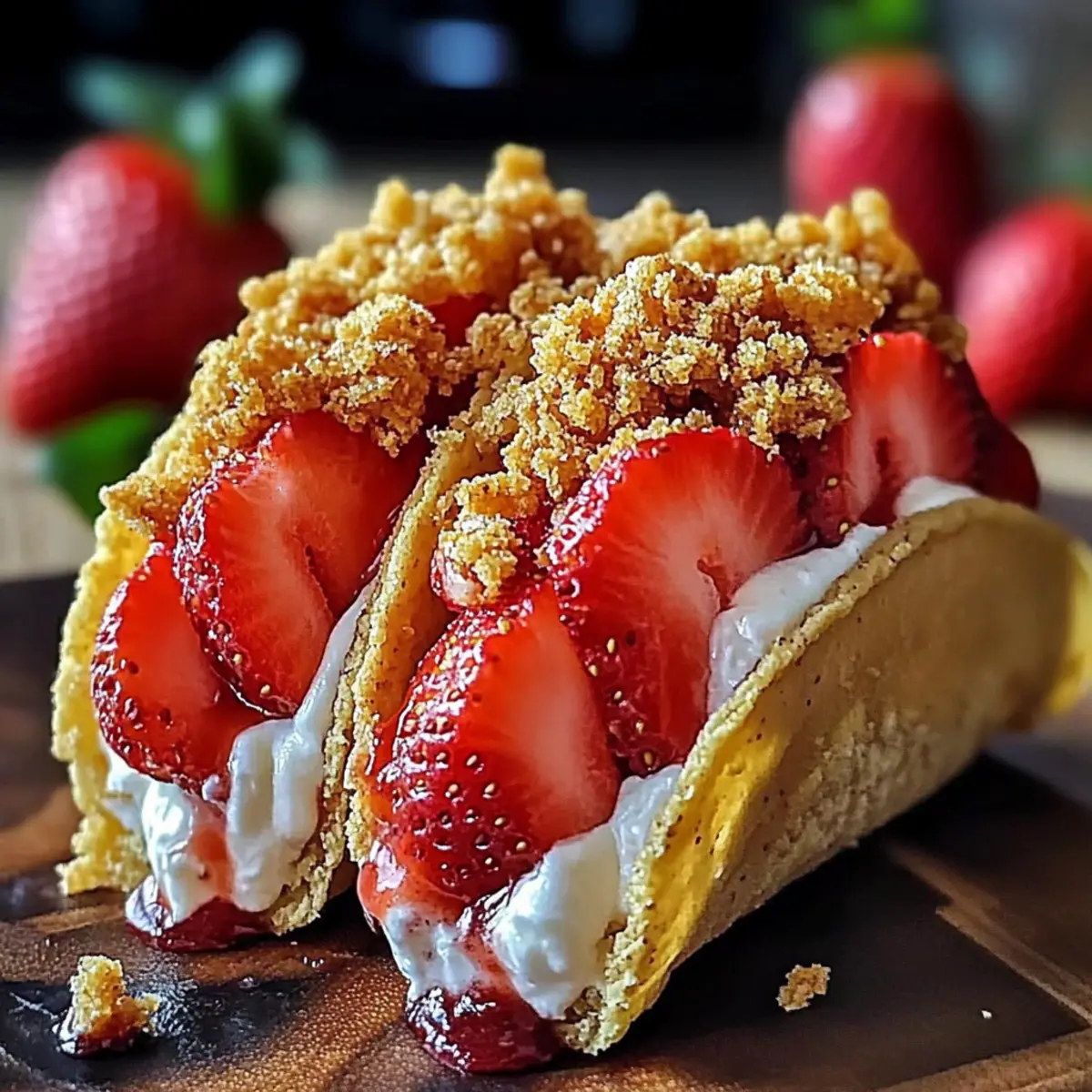 Strawberry Crunch Cheesecake Tacos are a fun dessert combining crispy taco shells with luscious cheesecake filling and fresh strawberries.
