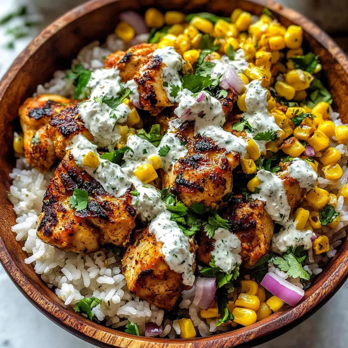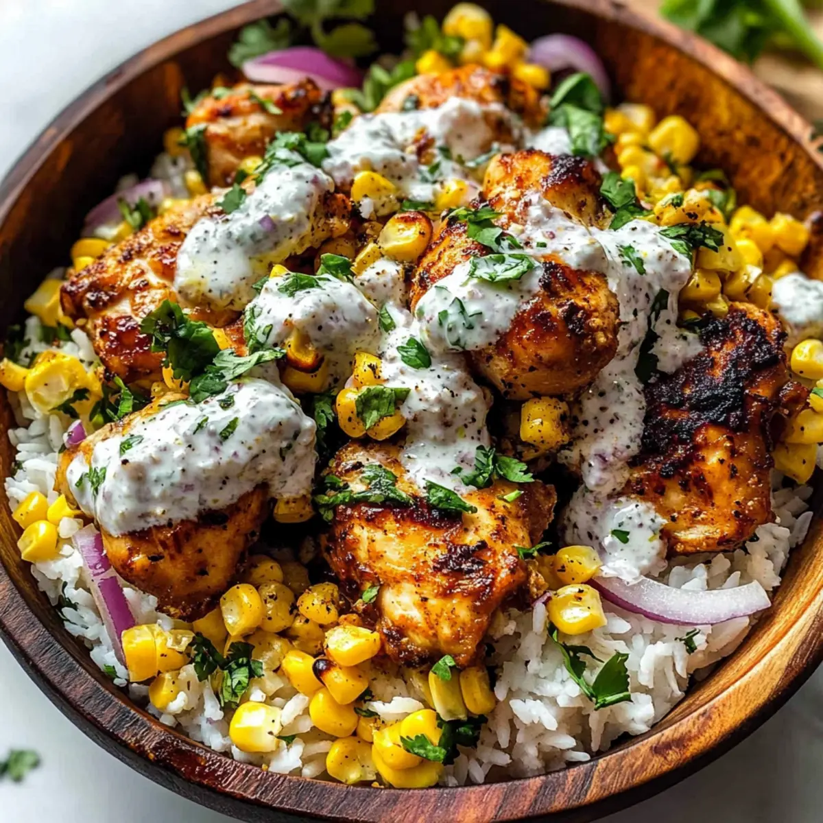 Facebook Twitter Pinterest LinkedInAs I stood in the kitchen, the intoxicating aroma of spices wafted through the air, instantly transporting me to a lively Mexican market. My mouth watered at the thought of a Tasty Street Corn Chicken Bowl, a perfect medley of juicy chicken thighs, sweet corn, and seasoned rice, all ready in just 30 minutes. This quick and easy recipe is a family-friendly delight that transforms weeknight dinners into something special without sacrificing time or flavor. With its creamy corn topping and zesty lime finish, you’ll find yourself eagerly returning for seconds! Curious about how to bring this vibrant dish to your table? Let’s dive into the details! Why is the Street Corn Chicken Bowl a Must-Try? Flavor Explosion: Each bite is a delightful mix of smoky, creamy, and spicy elements that celebrate Mexican cuisine. Quick Preparation: Ready in just 30 minutes, making it a perfect choice for busy weeknights. Family-Friendly: Everyone – from kids to adults – will love the vibrant colors and delicious taste! Versatile Ingredients: Feel free to swap chicken for beef or turkey or switch rice for quinoa based on your preferences. You can also try serving it alongside Hawaiian Chicken Sheet for a tasty variety during your week! One-Pot Wonder: Minimal cleanup means more time to enjoy the meal with loved ones. Prepare to savor every creamy, zesty bite of this delectable dish! Street Corn Chicken Bowl Ingredients • Ready to whip up this deliciousness? Here’s what you need! For the Chicken Marinade Boneless, Skinless Chicken Thighs – Juicy and tender; perfect for marinating to enhance flavor. Freshly Squeezed Lime Juice – Adds a zesty kick; substitute with lemon juice if needed. Avocado Oil – Great for marinating; you can swap it out for olive oil for extra flavor. Chili Powder – Brings the heat; consider smoked paprika for a milder touch. Ground Cumin – Adds depth; omit if you prefer a lighter flavor. Garlic Powder or Fresh Garlic – Infuses aromatic goodness; adjust fresh garlic to taste. Salt and Ground Black Pepper – Essential for seasoning; adjust to your personal taste. For the Street Corn Mixture Sweet Corn Kernels – Adds sweetness; grilled for best results; thaw frozen corn before use. Sliced Red Onion – Provides a nice crunch; substitute with green onions for a milder flavor. Sour Cream – Adds creaminess; Greek yogurt is a tangy alternative. Mayonnaise – Binds the mixture together; omit for a lighter version. Cotija Cheese – Traditional Mexican cheese that gives a salty kick; feta is a good substitute. For Assembling the Bowl Prepared Rice – Be sure to season for flavor; swap for brown rice or quinoa for a health boost. Fresh Cilantro Leaves – Adds a fresh herbal note; parsley works if cilantro is unavailable. Lime Wedges – Serves brightening flavors; a squeeze elevates the dish before serving. Step‑by‑Step Instructions for Street Corn Chicken Bowl Step 1: Marinate the Chicken In a mixing bowl, combine freshly squeezed lime juice, avocado oil, chili powder, ground cumin, garlic powder, salt, and pepper. Whisk until blended, then add the boneless, skinless chicken thighs to the marinade. Ensure each piece is well-coated and let them marinate for 15-30 minutes at room temperature while you prepare the other ingredients. Step 2: Sear the Chicken Heat a cast-iron skillet over medium-high heat until hot. Add the marinated chicken thighs, cooking for 8-10 minutes on each side until they are nicely browned and reach an internal temperature of 165°F. Once cooked, transfer the chicken to a cutting board, allowing it to rest for a few minutes before slicing it into strips. Step 3: Prepare the Street Corn Mixture In a large bowl, combine sweet corn kernels, sliced red onion, sour cream, mayonnaise, Cotija cheese, and a sprinkle of chili powder. Mix well to create a creamy and flavorful street corn topping. Season to taste with additional salt, pepper, and a splash of lime juice, ensuring the mixture is well-balanced and vibrant. Step 4: Heat the Rice While the chicken rests, warm the prepared rice in the microwave or on the stovetop. If using the stovetop, heat over low, adding a splash of water if necessary. Fluff the rice with a fork before serving, and stir in some chopped cilantro for an extra burst of freshness and flavor. Step 5: Assemble the Bowls To build your Street Corn Chicken Bowl, start by placing a generous layer of fluffy rice at the bottom of each serving dish. Top the rice with sliced chicken and a hearty scoop of the creamy street corn mixture. Garnish with additional Cotija cheese, fresh cilantro, and lime wedges for a zesty finish that elevates every bite. How to Store and Freeze Street Corn Chicken Bowl Fridge: Store the components separately in airtight containers for up to 4 days. This keeps the flavors fresh and prevents sogginess. Freezer: Both the chicken and corn mixture can be frozen for up to 3 months. For best results, cool them completely before transferring to freezer-safe bags. Reheating: Thaw frozen components in the fridge overnight. Reheat the chicken in a skillet over medium heat until warmed through. Serve with freshly cooked rice for the best taste. Assembly Tip: To maintain the vibrant texture of your Street Corn Chicken Bowl, combine the ingredients just before serving after reheating. What to Serve with Tasty Street Corn Chicken Bowl Fill your table with tantalizing flavors and textures that perfectly complement this hearty bowl. Warm Flour Tortillas: Soft and chewy, they’re perfect for scooping up the deliciousness, adding a fun, interactive element to your meal. Black Beans Seasoned with Cumin: A fiber-rich side that pairs beautifully, offering a savory contrast and earthy flavor that balances the sweetness of the corn. Cucumber and Radish Salad: The cool, crisp veggies lighten each bite, refreshing your palate in between the bold flavors of the chicken bowl. Toss in a zesty lime vinai