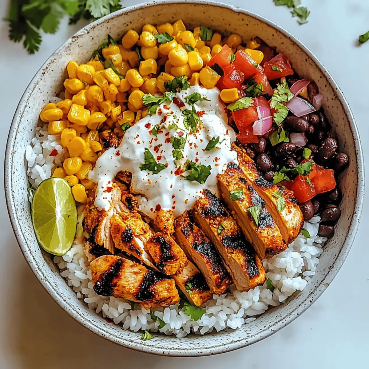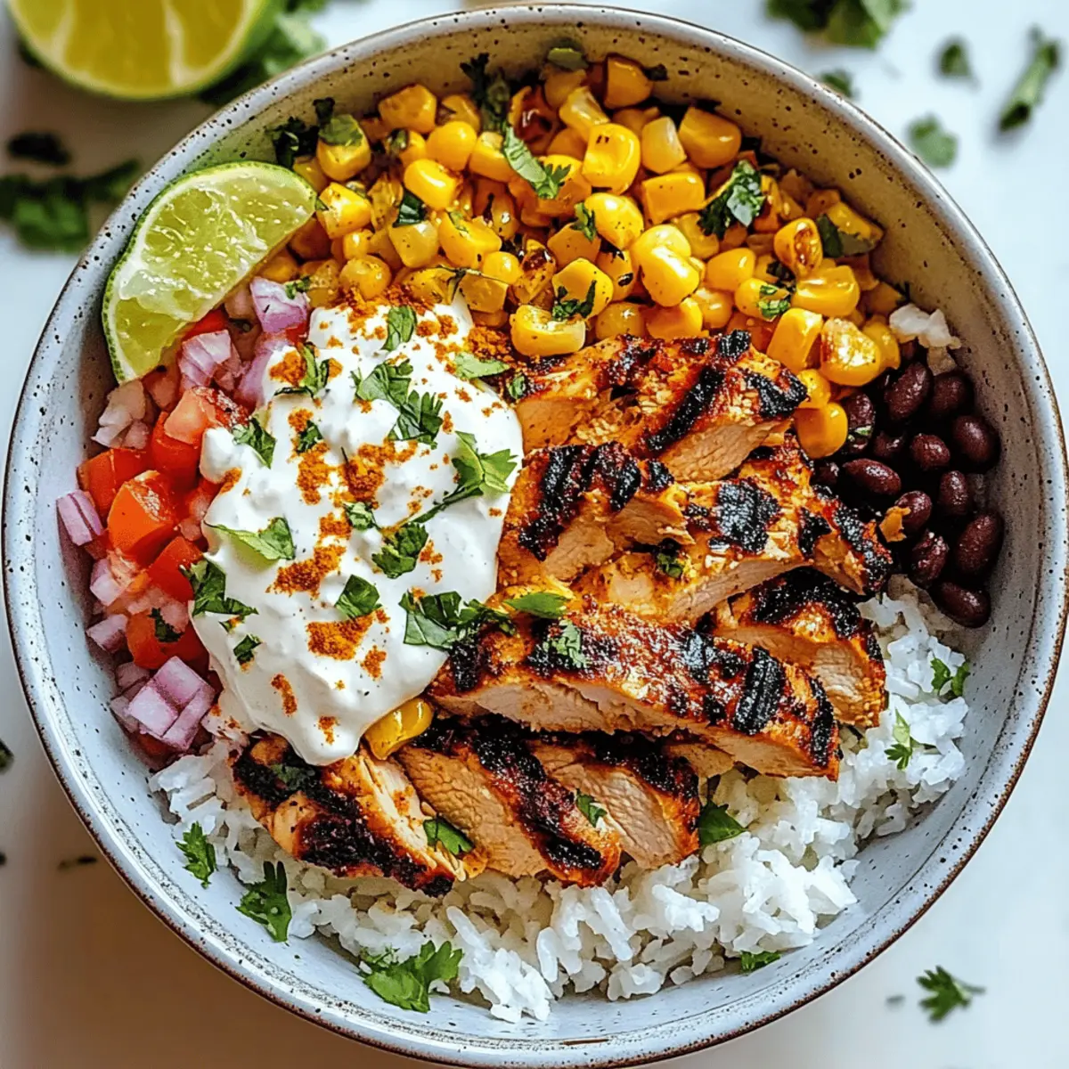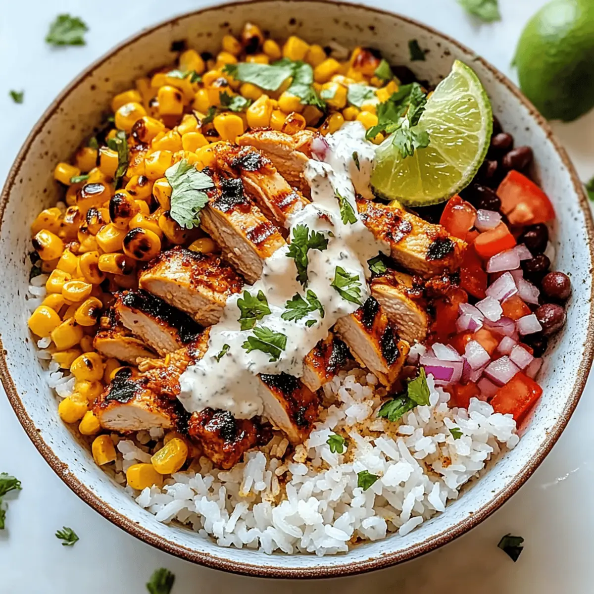 This Street Corn Chicken Rice Bowl combines grilled chicken, charred corn, and zesty lime crema for a delicious and customizable meal.