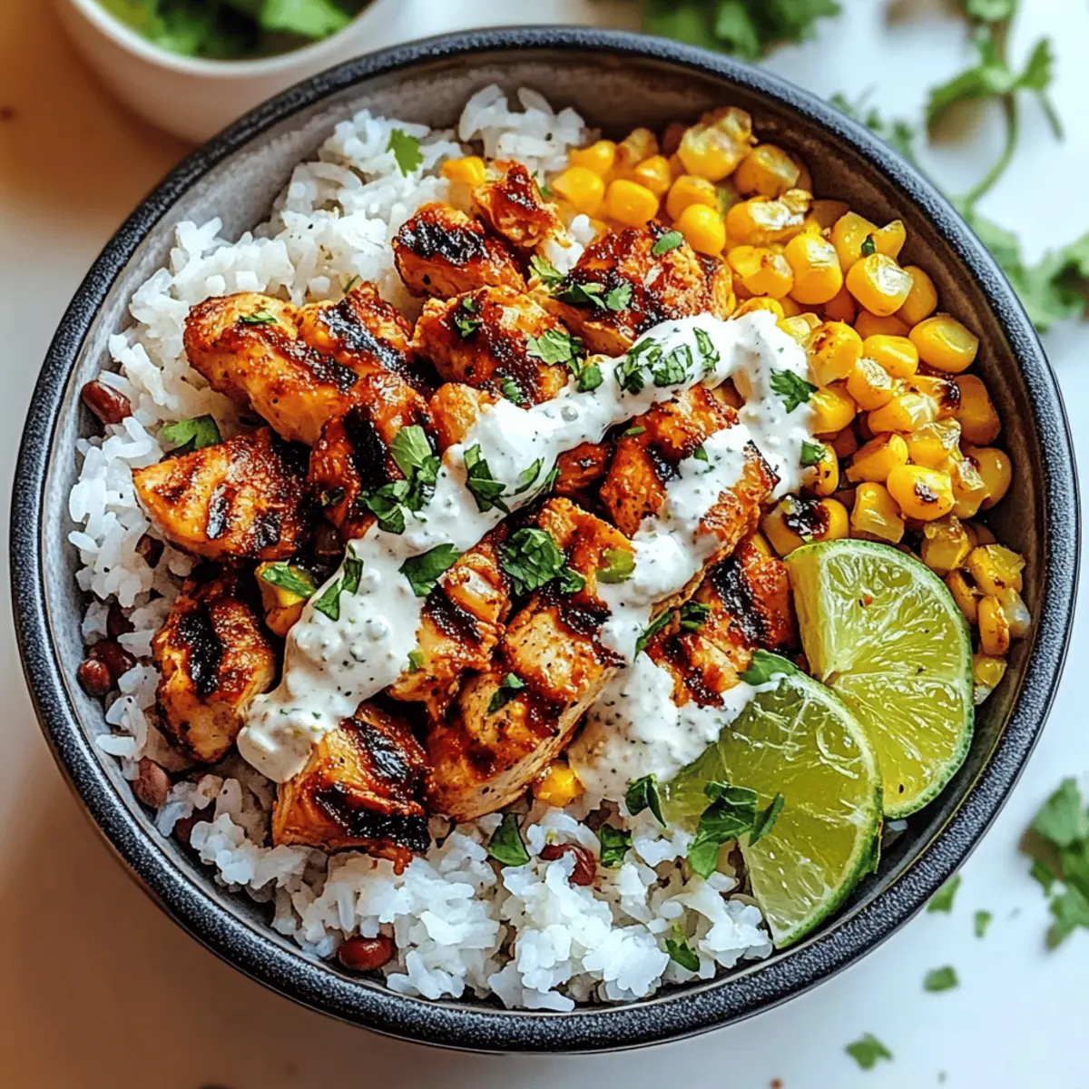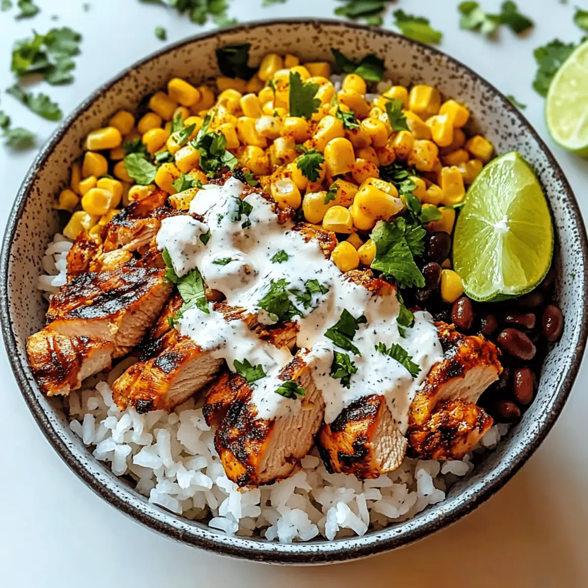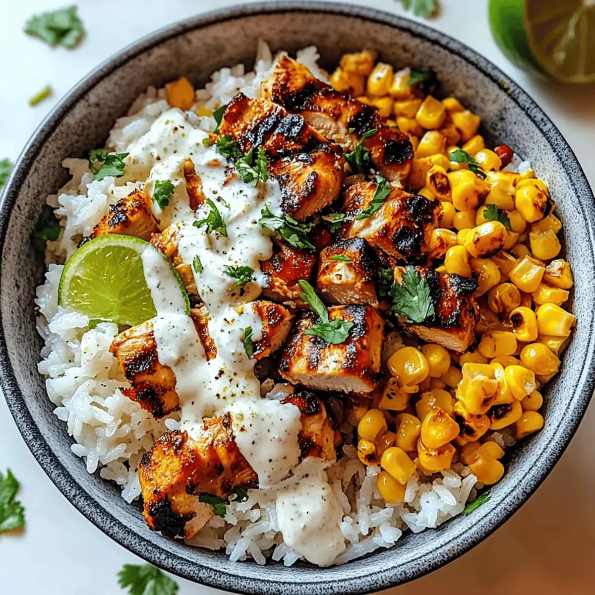 Experience the vibrant tastes of a Street Corn Chicken Rice Bowl, featuring grilled chicken, smoky corn, and zesty lime crema.