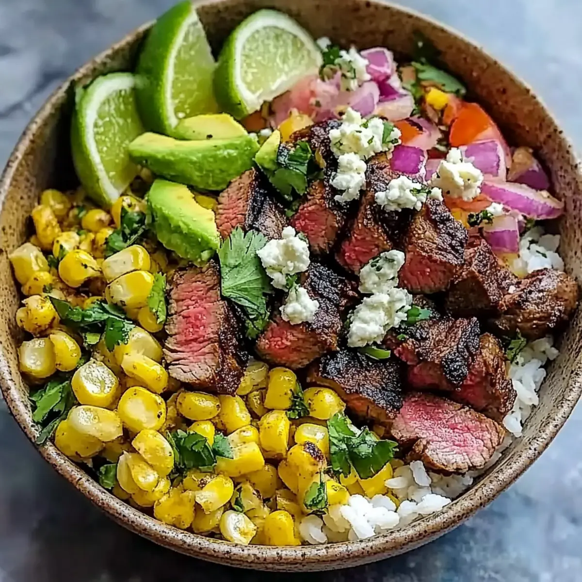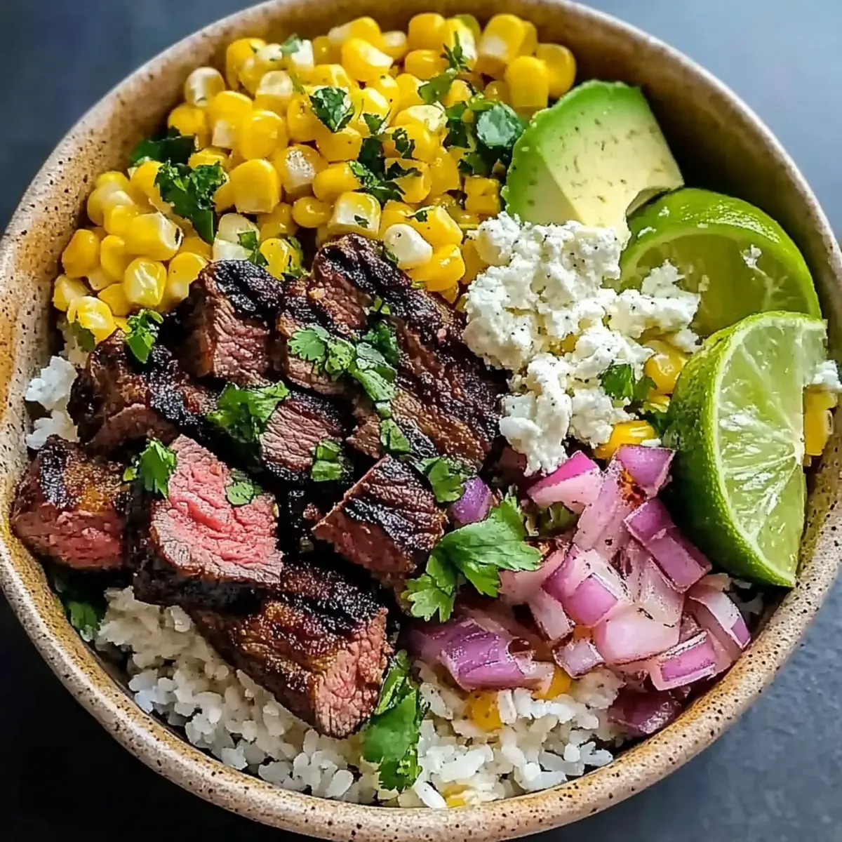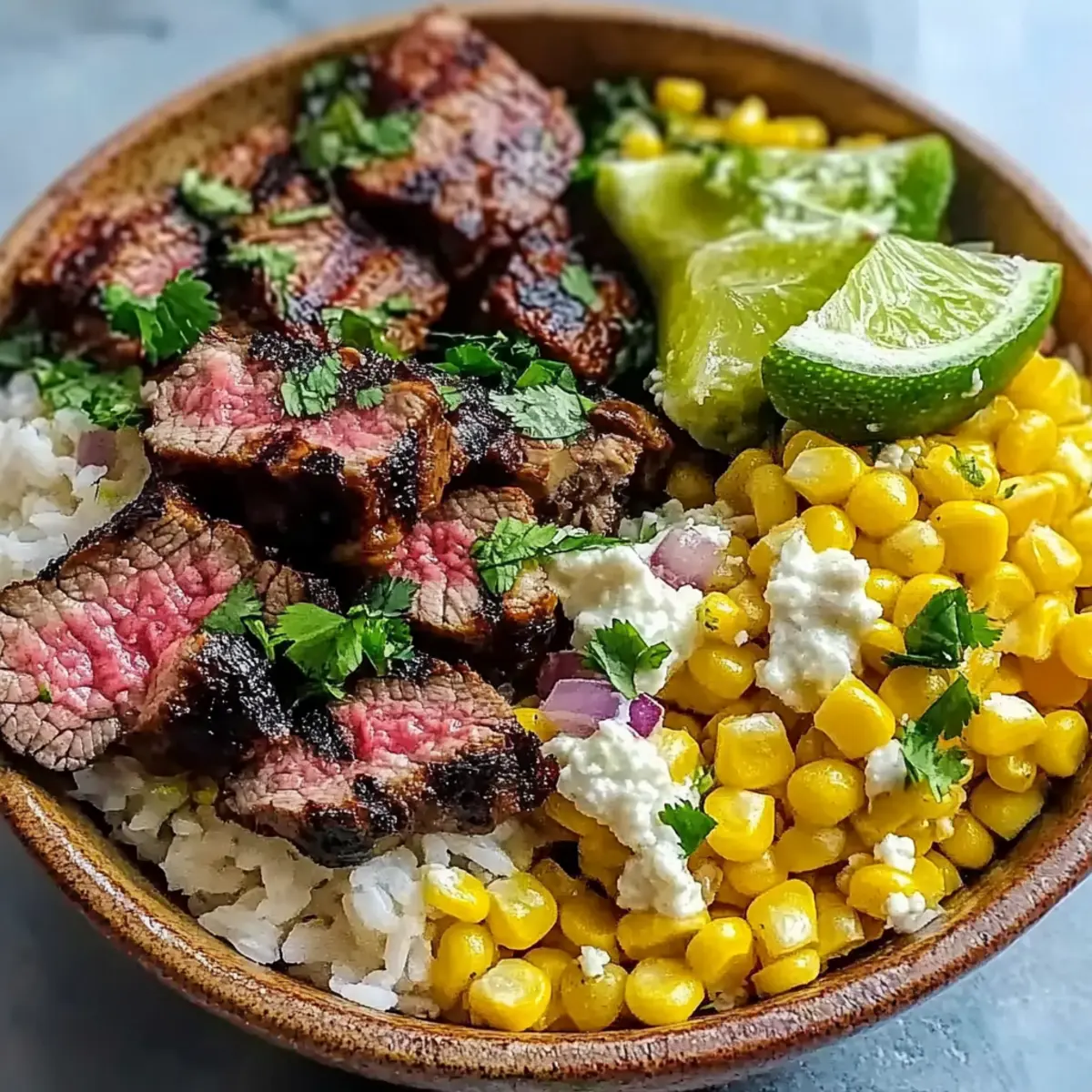 As I took a bite of this vibrant Street Corn Steak Rice Bowl, a wave of summer flavors transported me to a bustling Mexican mercado, where street vendors grill corn to perfection. This dish not only celebrates the irresistible combination of smoky grilled corn, juicy steak, and fluffy rice—it’s also incredibly customizable! You can easily swap in chicken, shrimp, or tofu, making it a favorite for everyone at the dinner table. Plus, with the option to add your favorite veggies like black beans or fresh tomatoes, you’ll create a wholesome, balanced meal that’s both satisfying and light. Ready to dive into this colorful bowl that captures the essence of summer? Let’s get cooking! Why is this recipe a must-try? Simplicity and Customization: This Street Corn Steak Rice Bowl is not only easy to prepare, but it also welcomes your creativity. Varied Proteins: Choose from steak, chicken, shrimp, or tofu, catering to all dietary preferences. Fresh Ingredients: Bursting with vibrant veggies like sweet corn and bell peppers, every bite is packed with flavor. Balanced Meal: With protein, carbs, and veggies, it’s a wholesome option for any night. Plus, why not pair it with a side of our Cheesy Hamburger Rice for extra deliciousness? Street Corn Steak Rice Bowls Ingredients For the Protein Flank Steak – Juicy and tender, providing a rich base; substitute with chicken or shrimp for varied tastes. Chicken – A lighter alternative with great absorbance of flavors; marinate for best results. Shrimp – Quick-cooking and perfect for seafood lovers; sauté briefly to avoid overcooking. Tofu – Great vegetarian option; press well to remove moisture for better grilling. For the Rice Base Cooked White Rice – Fluffy and adaptable, serving as the bowl’s foundation; switch to brown rice for added fiber. For the Veggies Corn Kernels – Sweet and crunchy; fresh corn enhances flavor, but frozen works too! Red Bell Pepper – Adds vibrant color and sweetness; use green or yellow bell peppers if desired. Red Onion – A touch of natural sweetness with a hint of tang; swap for shallots or yellow onions to taste. For the Toppings Fresh Cilantro – Bright and fresh; omit for a cilantro-free version or substitute with parsley. Avocado – Creamy goodness packed with healthy fats; replace with guacamole for an easier option. Lime – Adds zesty brightness; fresh lime juice is best for optimum flavor; bottled is a quick fix. Cotija Cheese – Adds a salty, creamy finish; feta cheese is a worthy substitute. Chili Powder – Brings warm, smoky spice; adjust to your preference or swap for cumin for a different twist. Sour Cream and Mayonnaise – Create a creamy sauce component; Greek yogurt serves as a lighter alternative. Salt and Pepper – Essential for enhancing and balancing flavors; don’t skip these basics! Now you’re all set with everything you need to create your delightful and customizable Street Corn Steak Rice Bowls! Step‑by‑Step Instructions for Street Corn Steak Rice Bowls Step 1: Preheat the Grill Begin by preheating your grill to medium-high heat, around 400°F (200°C), ensuring it’s ready for that perfect sear. You want the grill grates to be hot enough to sear the steak and veggies, ideally glowing red. This critical step ensures a nice char on all ingredients, contributing to the rich flavors of your Street Corn Steak Rice Bowls. Step 2: Season the Flank Steak While the grill warms up, generously season your flank steak with salt, pepper, and chili powder. Use your hands to rub the seasonings into the meat for even coverage. This not only enhances the flavor but also tenderizes the steak during the grilling process. Set the seasoned steak aside for about 10 minutes to let the flavors meld before grilling. Step 3: Grill the Flank Steak Once the grill is hot, place the seasoned flank steak on the grates. Grill for approximately 4-5 minutes on each side for medium-rare, adjusting time according to your preferred doneness. You’re aiming for a nice char with grill marks on the outside. After grilling, remove the steak and let it rest for about 5 minutes to allow the juices to redistribute. Step 4: Grill the Corn and Veggies Now it’s time to grill your corn, red bell pepper, and red onion. Place them directly on the grill, cooking for 5-7 minutes until they’re charred and tender. Turn occasionally for even cooking, fully enjoying the aroma of the fresh veggies caramelizing. This quick grilling adds smoky depth to your Street Corn Steak Rice Bowls. Step 5: Prepare the Creamy Sauce In a small bowl, combine sour cream, mayonnaise, and a bit more chili powder to create a creamy sauce. Mix well until smooth and adjust seasoning to your taste. This sauce serves as a decadent drizzle over your finished dish, adding a lovely layer of flavor to your Street Corn Steak Rice Bowls. Step 6: Assemble the Bowls To assemble your bowls, start with a generous layer of cooked white rice as the base. Add the sliced steak on top, followed by the grilled corn, bell peppers, and red onions. Then, slice up an avocado and place those creamy pieces in your bowl alongside a sprinkle of cotija cheese. Step 7: Garnish and Serve Finally, garnish your Street Corn Steak Rice Bowls with fresh cilantro and a dollop of your creamy sauce. Serve with lime wedges for an extra zing of freshness. Enjoy your beautifully arranged bowls, knowing you’ve created a vibrant dish packed with flavor and nutrients! Expert Tips for Street Corn Steak Rice Bowls Perfect Seasoning: Always season the flank steak generously to enhance its rich flavor; don’t skip on salt, pepper, and chili powder for delicious results. Don’t Overcook: Keep a close eye on the steak; grilling for too long can lead to dry meat. Use a meat thermometer for perfect doneness. Grill Fresh Corn: For maximum sweetness, ensure your corn is grilled until charred; if using frozen, thaw and pat dry before grilling. Make it Your Own: Feel free to customize y