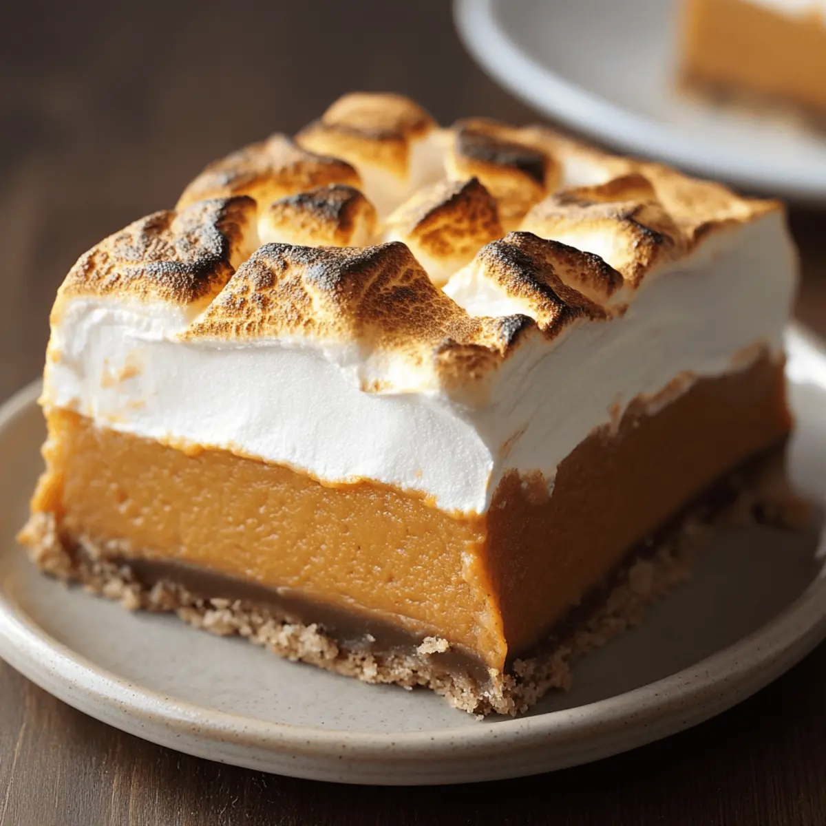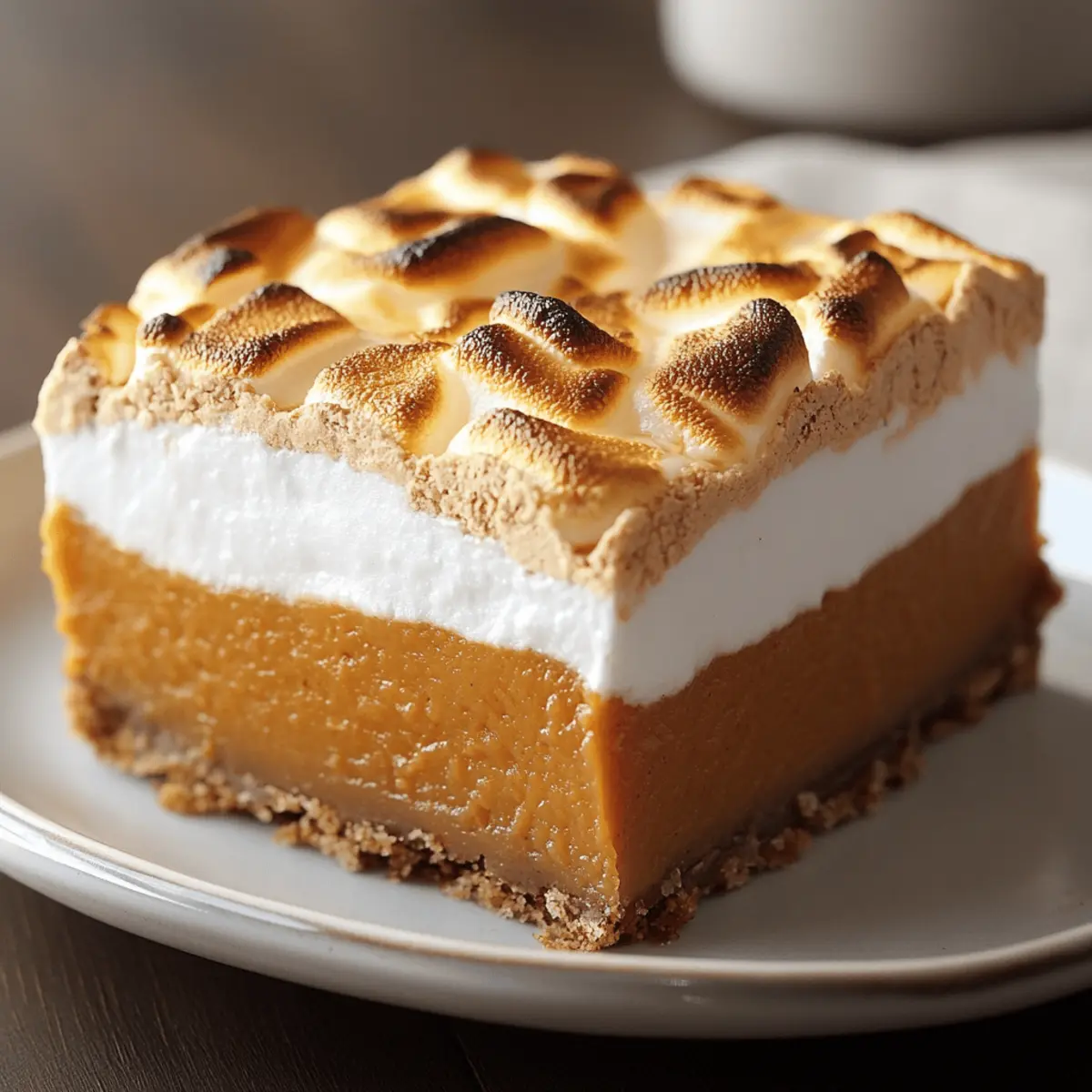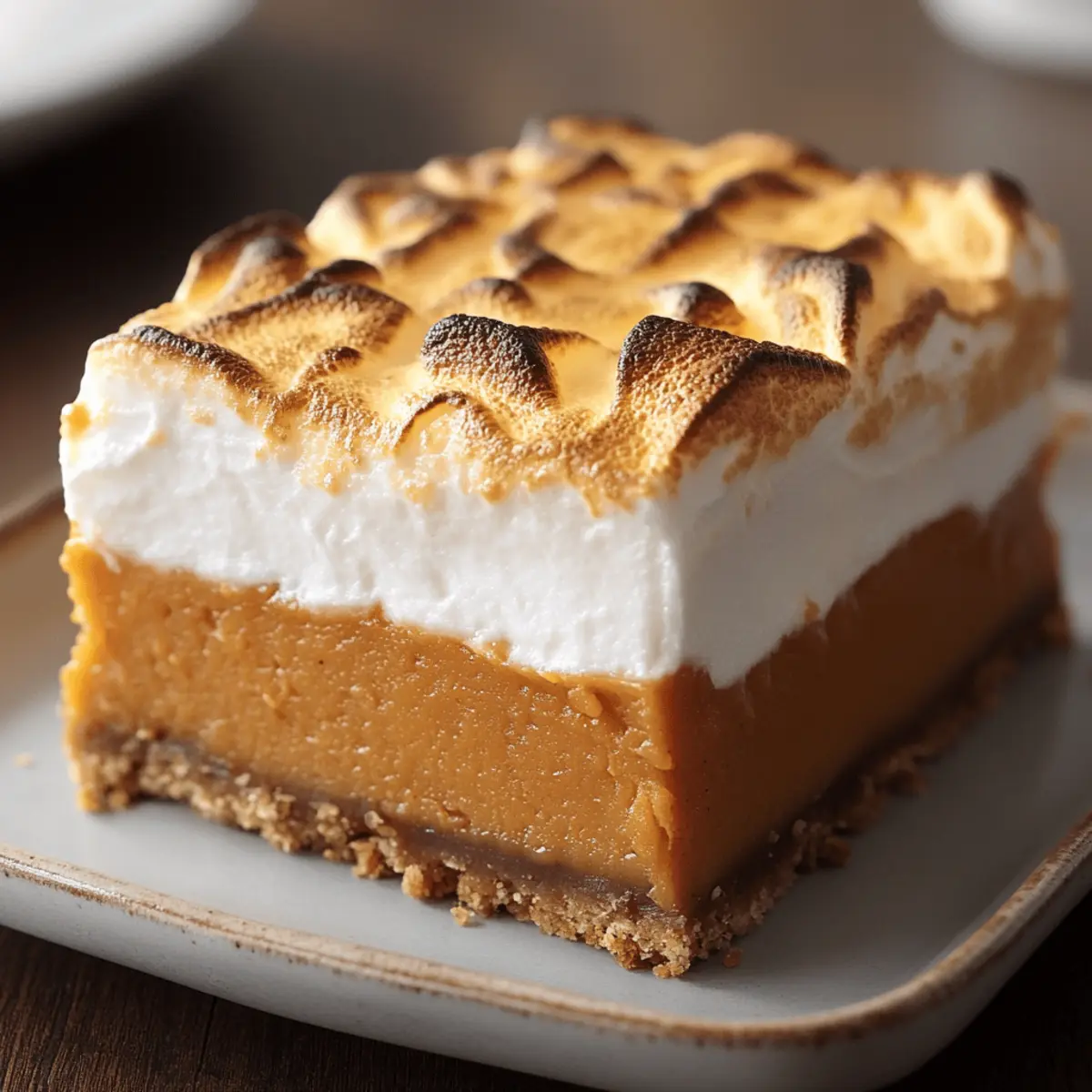 The aroma of sweet, spiced goodness fills the air, instantly transporting me to cozy fall gatherings. These Sweet Potato Pie Bars blend the comforting flavors of autumn with a delightful twist that makes them the perfect Thanksgiving treat. The buttery graham cracker crust gives way to a velvety sweet potato filling, topped with a fluffy layer of homemade marshmallow that you simply can’t resist. Not only do these bars offer a beautiful presentation, but their easy preparation means you can whip them up without stress, making them a crowd-pleaser at any celebration. Whether shared among family or savored during quiet evening moments, these bars will warm your heart and satisfy your cravings. Ready to discover how to make a dessert that captures the essence of the season? Why are Sweet Potato Pie Bars special? Indulge in this unique twist on a classic dessert that’s perfect for fall! Easy to make, you can whip these Sweet Potato Pie Bars up in under an hour. Crowd-pleasing and beautiful, they’re destined to be the highlight of your Thanksgiving table. Flavorful layers of buttery graham cracker crust, creamy sweet potato filling, and fluffy toasted marshmallow create a delightful treat your family and friends will adore. Versatile options like adding chocolate chips or spices allow you to make this recipe truly your own! Sweet Potato Pie Bars Ingredients For the Crust • Graham Crackers – A perfect base for the crust; substitute with digestive biscuits, gingersnaps, or vanilla wafers for a flavorful twist. • Granulated Sugar – Adds a hint of sweetness to the crust; feel free to replace with brown sugar for a deeper flavor. • Fine Sea Salt – Enhances the overall flavor profile and balances sweetness. • Unsalted Butter – Provides richness and binds the crust together; make sure it’s melted for smooth mixing. For the Filling • Fresh Sweet Potato Puree – The star of the show, offering natural sweetness and moisture; avoid canned options for best texture. • Eggs – Act as a binder for the filling and add richness; using large eggs ensures consistent results. • Whole Milk and Heavy Cream – Bring creaminess to the filling, or swap with non-dairy milk and coconut cream for a dairy-free choice. • Bourbon (or Vanilla) – Adds an extra layer of flavor; omit for a non-alcoholic treat. • Ground Cinnamon, Ginger, and Cloves – Warm spices that evoke fall; adjust quantities to match your personal taste preferences. For the Marshmallow Topping • Egg Whites – Essential for creating the marshmallow’s fluffy structure. • Cream of Tartar – Stabilizes the whipped egg whites for perfect peaks. • Light Corn Syrup – Prevents sugar crystallization; crucial for that smooth marshmallow finish. • Water – Assists in dissolving sugar during marshmallow preparation. These Sweet Potato Pie Bars ingredients are simple yet come together to create a delicious fall dessert that you and your loved ones are sure to enjoy! Step‑by‑Step Instructions for Sweet Potato Pie Bars Step 1: Preheat and Prepare the Pan Preheat your oven to 350°F (175°C). Line an 8×8-inch metal baking pan with foil, ensuring the edges hang over for easy removal later. Grease the foil lightly with cooking spray or butter. This step sets up your Sweet Potato Pie Bars for easy serving and adds to the delightful texture of the crust. Step 2: Make the Crust In a mixing bowl, combine the crushed graham crackers, granulated sugar, and fine sea salt. Drizzle in the melted unsalted butter and stir until the mixture resembles wet sand. Press this mixture evenly into the bottom of your prepared pan. Bake for 10 minutes until golden and fragrant, then let it cool completely at room temperature while you prepare the filling. Step 3: Prepare the Sweet Potato Filling In a large bowl, whisk together the fresh sweet potato puree, granulated sugar, large eggs, whole milk, heavy cream, bourbon (if using), salt, ground cinnamon, ginger, and cloves. Beat until the mixture is smooth and fully combined, ensuring the creamy filling will complement the crust perfectly. This filling is what makes your Sweet Potato Pie Bars a crowd-pleasing success. Step 4: Bake the Filling Pour the sweet potato mixture over the cooled graham cracker crust, spreading it evenly. Bake in the preheated oven for 40 minutes, or until the filling is set with a slight wobble in the center. You’ll know it’s ready when the edges look firm and the top has a soft, shiny appearance. Once baked, allow it to cool for a short while. Step 5: Whip Up the Marshmallow Topping For the marshmallow topping, in a mixing bowl, beat the egg whites with cream of tartar until soft peaks form. While the egg whites are beating, combine the granulated sugar, light corn syrup, water, and a pinch of salt in a saucepan. Boil this mixture until it reaches 240°F (115°C) on a candy thermometer. Step 6: Combine and Beat Once the sugar syrup has reached the right temperature, carefully drizzle it into the whipped egg whites while continuing to beat on high speed. Continue whipping until the mixture is thick, glossy, and fluffy—about 5-7 minutes. Finally, add vanilla extract for that unmistakable marshmallow flavor, blending well to incorporate. Step 7: Spread and Toast the Marshmallow Using a spatula, spread the fluffy marshmallow topping evenly over the set sweet potato filling. If you have a kitchen torch, lightly toast the marshmallow until golden. Alternatively, place the pan under the broiler for a few minutes, keeping a close eye to prevent burning. The goal is a perfectly golden and slightly toasted marshmallow layer. Step 8: Chill and Serve Let your Sweet Potato Pie Bars cool at room temperature for about 15 minutes, then transfer them to the refrigerator. Chill for at least one hour to allow the flavors to meld and the filling to set nicely. Once fully chilled, lift the bars out using the foil overhang and slice them into squares for serving. Expert Tips 