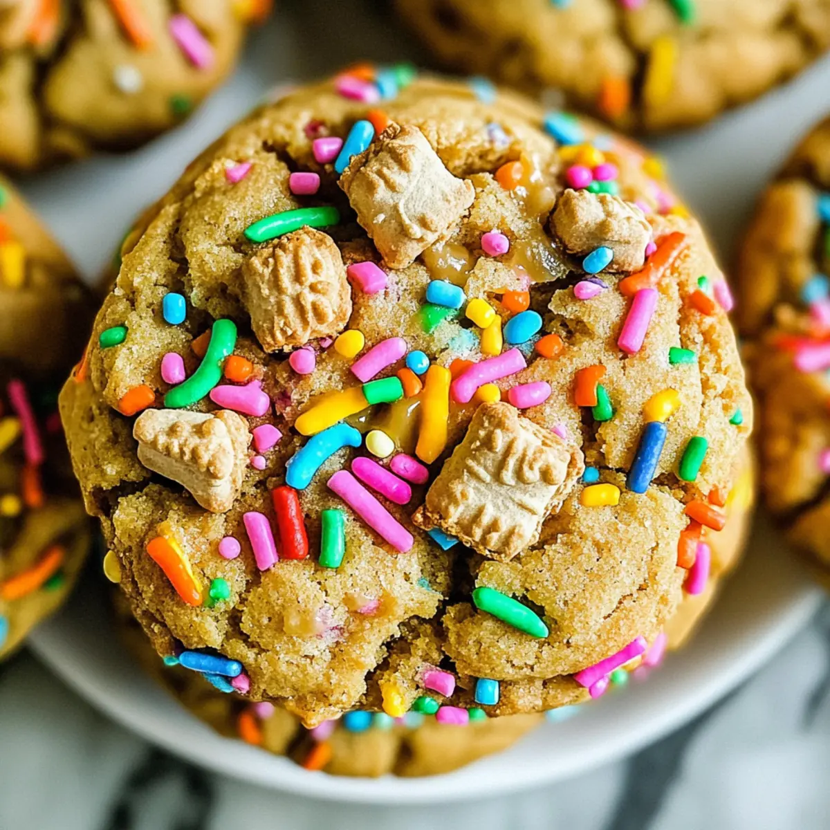 Facebook Twitter Pinterest LinkedInI watched as the kids at the birthday party dove headfirst into a sea of sprinkles and cookie butter, their laughter ringing like a bell. That’s when I knew I had to recreate the magic of those Teddy Graham Funfetti Stuffed Cookie Butter Cookies. Each giant, gooey treat is a joyful explosion of flavor, featuring a creamy center of cookie butter enveloped in a soft, chewy shell, and adorned with crunchy Teddy Grahams and vibrant sprinkles. Not only are these cookies an instant crowd-pleaser, but they also pack a delightful twist of nostalgia into every bite. Perfect for gatherings or a cozy night at home, they’re sure to win hearts and sugar-craving bellies alike! Ready to bring a little whimsy into your baking? Let’s dive in! Why Are These Cookies So Irresistible? Joyful Flavors: Each bite delivers a burst of sweetness, combining cookie butter with vibrant Funfetti sprinkles that make every cookie feel like a celebration. Childhood Nostalgia: Featuring Teddy Graham toppings, these cookies evoke warm memories of childhood treats, instantly making them a hit among both kids and adults. Versatile Fun: Whether enjoyed at parties or packed as homemade gifts, they cater to any occasion, just like my Honey Butter Chicken dish that everyone loves! Simplicity: Easy to create with minimal fuss, this recipe allows even novice bakers to shine with impressive, Instagram-worthy cookies. Texture Delight: Soft, chewy outer layers envelop a gooey, melty center—truly a perfect marriage of textures that will keep everyone coming back for more! Ready to dive into baking? Let’s get started on these delicious cookies! Teddy Graham Funfetti Stuffed Cookie Butter Cookies Ingredients For the Cookie Dough Unsalted Butter – Provides moisture and richness; salted butter can be used if you reduce added salt. Brown Sugar – Adds moisture and deep caramel flavor; substitute with coconut sugar for a different twist. Granulated Sugar – Sweetens the dough and helps with browning; reduce slightly for less sweetness. Vanilla Extract – Enhances flavor; stick to pure vanilla extract for the best results. Large Eggs – Binds and moistens the dough; avoid substitutes for the best texture. Cake Flour – Creates tender cookies; all-purpose flour can be used but may alter texture. All-Purpose Flour – Provides structure; for a gluten-free treat, use a suitable flour blend. Baking Soda & Baking Powder – Essential leavening agents; ensure they are fresh for proper rise. Cinnamon – Adds warmth; omit if you prefer a simpler flavor profile. Salt – Balances sweetness; essential but can be reduced for low-sodium needs. For the Filling and Topping Cookie Butter – The star of our cookie that adds a creamy, sweet filling; may substitute with Nutella or nut butter. Crushed Teddy Grahams – Adds delightful texture and flavor; graham cracker crumbs work in a pinch. Teddy Grahams for Topping – Provides a cute crunchy topping; mini marshmallows can be used for a different look. Sprinkles – Brings fun and color; feel free to use any variety that suits your celebration. Let’s gather these ingredients and create magic in the kitchen with these Teddy Graham Funfetti Stuffed Cookie Butter Cookies! Step‑by‑Step Instructions for Teddy Graham Funfetti Stuffed Cookie Butter Cookies Step 1: Prepare the Cookie Butter Begin by scooping out dollops of cookie butter, about a tablespoon each, and placing them on a sheet of parchment paper. Freeze these dollops for at least 1 hour or until solid, ensuring they are well-formed and firm. This step is crucial for preventing spreading during baking, so you’ll have gooey centers when you bite into your Teddy Graham Funfetti Stuffed Cookie Butter Cookies. Step 2: Cream the Butters and Sugars In a large mixing bowl, cream together 1 cup of unsalted butter with ¾ cup of brown sugar and ½ cup of granulated sugar using a hand mixer. Beat on medium speed for about 2–3 minutes or until the mixture is light and fluffy with a pale color. This process creates air in the dough, resulting in a soft texture for your cookies. Step 3: Add Eggs and Vanilla Once your butter and sugars are well combined, add in 2 large eggs and 2 teaspoons of vanilla extract to the bowl. Mix on low speed until everything is just blended, about 1 minute. This blend will enrich the flavor of your Teddy Graham Funfetti Stuffed Cookie Butter Cookies and help bind the dough. Step 4: Mix the Dry Ingredients In a separate bowl, whisk together 1 cup of cake flour, 1 cup of all-purpose flour, 1 teaspoon of baking soda, 1 teaspoon of baking powder, ½ teaspoon of cinnamon, and ½ teaspoon of salt. This dry mixture adds structure and stability to your cookie dough, ensuring they stay chewy and delicious. Be sure to incorporate well to avoid any lumps! Step 5: Combine Wet and Dry Ingredients Gradually mix your dry ingredients into the wet mixture about ½ cup at a time, ensuring everything is fully blended. Mix until a soft dough forms, which should take about 2–3 minutes at medium speed. The dough will be slightly sticky but smooth, and it’s ready for shaping the cookies. Step 6: Shape the Cookie Dough For each cookie, take approximately ¼ cup of dough and flatten it into a disk in your palm. Place one frozen dollop of cookie butter in the center, then fold the dough over to seal it completely. Roll it gently between your palms to form a ball, ensuring no filling spills out. This step is crucial to achieve the stuffed effect in your Teddy Graham Funfetti Stuffed Cookie Butter Cookies. Step 7: Add Toppings Press 5-6 crushed Teddy Grahams into the top of each cookie and then roll them gently in rainbow sprinkles for a festive touch. This fun step not only enhances appearance but adds delightful texture and flavor. Place each prepared cookie on a baking sheet lined with parchment paper, leaving enough space to allow for spreading. Step 8: Bake the Cookies Preheat your oven to 350