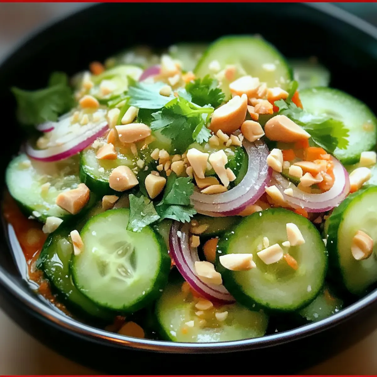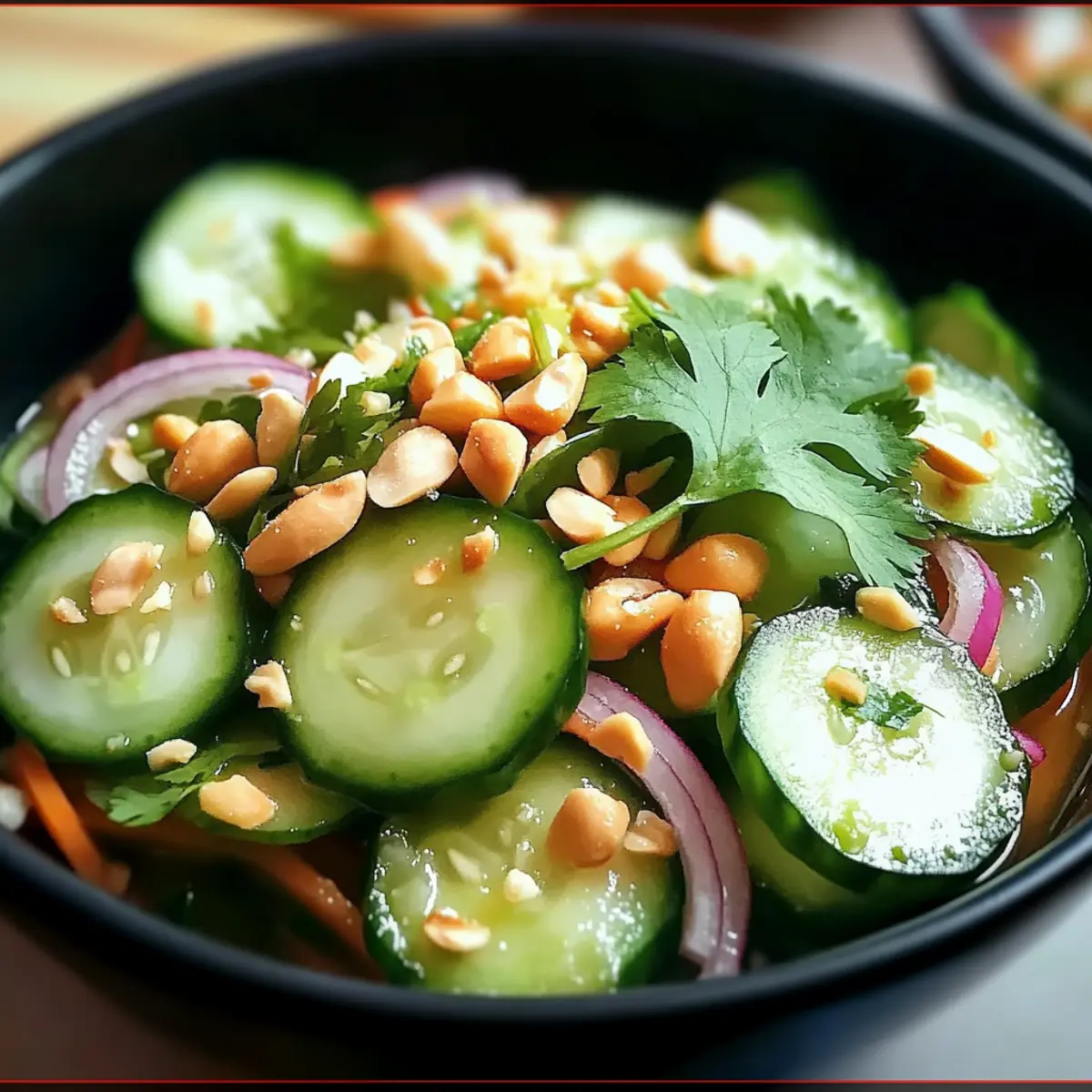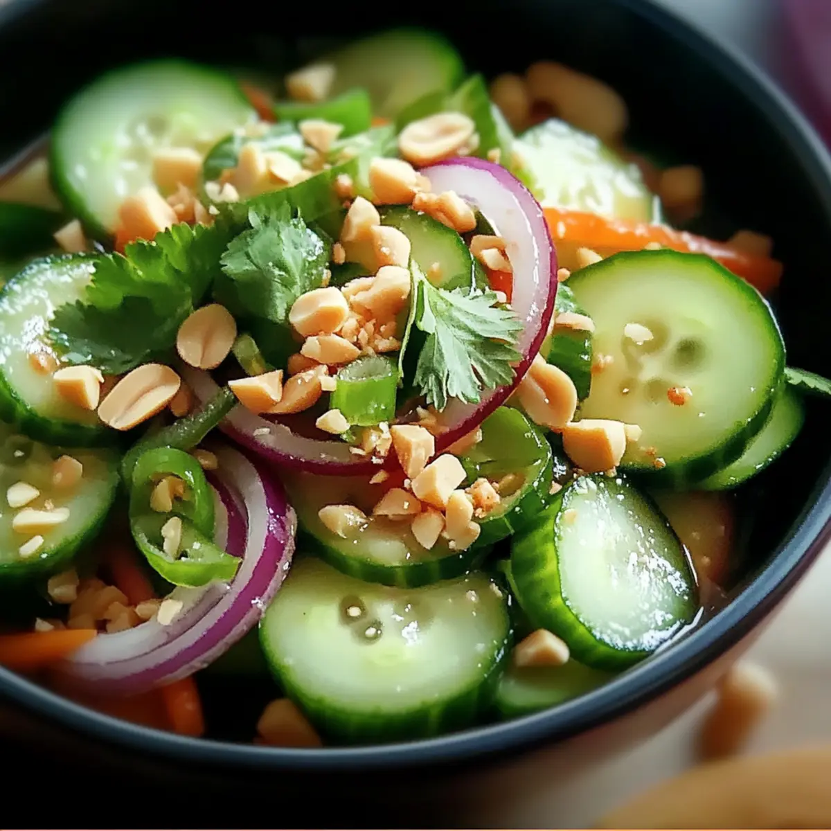 Facebook Twitter Pinterest LinkedInAs the sun sets on a warm evening, there’s nothing quite like the crunch of fresh cucumbers mingling with a zesty Thai dressing to awaken my palate. This Thai Cucumber Salad not only offers a delightful crunch but is also a breeze to whip up, making it the perfect companion for a summer barbecue or a light afternoon snack. With its vibrant mix of colors and flavors, it’s a customizable dish that caters to every taste—whether you prefer it mild or with a spicy kick. Plus, it’s vegan and gluten-free, allowing you to enjoy healthy eating without sacrificing flavor. Ready to elevate your meal with this refreshing side? Let’s dive into the world of Thai-inspired cuisine! Why is This Salad a Must-Try? Fresh, Crunchy Ingredients: The combination of cucumbers, red onions, and carrots creates an irresistible crunch that refreshes your taste buds. Zesty, Tangy Dressing: A delightful mix of rice vinegar and garlic gives this salad a punch of flavor that brightens up any dish. Customizable for Everyone: Whether spicy or mild, gluten-free or vegan, this salad caters to all dietary needs without sacrificing taste. Perfect for Meal Prep: Easy to make ahead, it can be stored separately to maintain that satisfying crunch until you’re ready to enjoy. Versatile Side Dish: Pair it with your favorite grilled meats or enjoy it as a light snack—everyone will be coming back for seconds! For more delicious side options, check out our Pineapple Cucumber Salad or Chicken Skewer Salad. Thai Cucumber Salad Ingredients • Refreshing and flavorful components await! For the Salad Cucumbers – The star of this dish, offering a cool, crunchy texture; peel for added fiber. Red Onions – Imparts a sharp, slightly sweet flavor; shallots can substitute for a milder option. Carrots – Adds a dose of sweetness and crunch; you can shred or julienne them as desired. Fresh Cilantro – Enhances with aromatic freshness; fresh mint can be an intriguing alternative. For the Dressing Rice Vinegar – The tangy base that sets the flavor tone; apple cider vinegar is a good substitute if needed. Sugar – Balances the tanginess of the vinegar; honey can work beautifully for natural sweetness. Minced Garlic – Elevates the flavor profile; fresh garlic is recommended for maximum impact. Red Chili Flakes – Optional heat-maker, adjust to your spice tolerance; fresh Thai chilies can be added for a fiery kick. For the Garnish Crushed Peanuts – Adds a crunchy finish and nutty flavor; swap with almonds or sunflower seeds for a nut-free option. Step‑by‑Step Instructions for Thai Cucumber Salad Step 1: Prepare the Vegetables Begin by washing the cucumbers thoroughly under cold water. You may choose to peel them for a smoother texture or leave the skin on for added fiber. Slice the cucumbers into thin rounds using a sharp knife, aiming for uniformity for even flavor distribution. Set these aside in a large mixing bowl while you prep the other ingredients. Step 2: Slice and Shred Next, take your red onion and slice it thinly, creating delicate rings that will blend beautifully into the salad. Then, peel the carrot and shred it using a box grater or a mandoline for precision. The vibrant orange of the shredded carrot will blend nicely with the green of the cucumbers. Add both the onions and shredded carrots to the bowl with the cucumbers. Step 3: Make the Dressing In a small bowl, combine the rice vinegar, sugar, minced garlic, salt, and red chili flakes. Use a whisk or fork to mix well until the sugar is fully dissolved, creating a fragrant dressing. The balance of sweetness and tanginess is essential for the Thai Cucumber Salad, so ensure the flavors meld together smoothly before proceeding. Step 4: Toss Everything Together Pour the dressing over the cucumber, onion, and carrot mixture in the large bowl. Using tongs or a large spoon, gently toss the ingredients together, ensuring that each piece of vegetable is well-coated with the dressing. This step is vital to bring out the bright flavors in your Thai Cucumber Salad, so make sure all ingredients are evenly mixed. Step 5: Let the Flavors Meld Allow the salad to sit undisturbed at room temperature for about 10 minutes. This resting period helps the cucumbers absorb the dressing, enhancing the flavors. You will notice the vegetables start to wilt slightly, which results in a more cohesive taste. During this time, prepare your cilantro for the final touches on the salad. Step 6: Add Fresh Herbs and Serve Just before serving, chop the fresh cilantro and sprinkle it over the salad, giving it a bright and aromatic finish. If you’re using crushed peanuts for added texture, incorporate them now as well. Give the salad a final toss to mix the cilantro and peanuts evenly, preparing a vibrant Thai Cucumber Salad ready to delight your taste buds. Step 7: Optional Chilling Time If desired, place the salad in the refrigerator for an additional 15-20 minutes to chill before serving. This step can intensify the flavors further and make the salad even more refreshing. However, if you prefer it fresh and crunchy, serving immediately is also a great choice! Adjust the dressing to your liking if needed before you enjoy. What to Serve with Thai Cucumber Salad As you prepare to elevate your dining experience, consider these delightful pairings that will complement and enhance your meal. Grilled Chicken Skewers: The smoky, charred flavor of grilled chicken beautifully contrasts with the crisp freshness of the salad. A perfect protein addition! Thai Sticky Rice: Its sweet, sticky texture serves as a lovely base, balancing the bright, tangy notes of your salad. Don’t forget the side of mango for a sweet touch. Spicy Shrimp Tacos: Crunchy, zesty shrimp tucked into a warm tortilla creates a dynamic dish when paired with this refreshing salad. The spices in the shrimp will awaken the taste buds! Lemongrass Soup: A warming broth rich in aromatic herbs provide