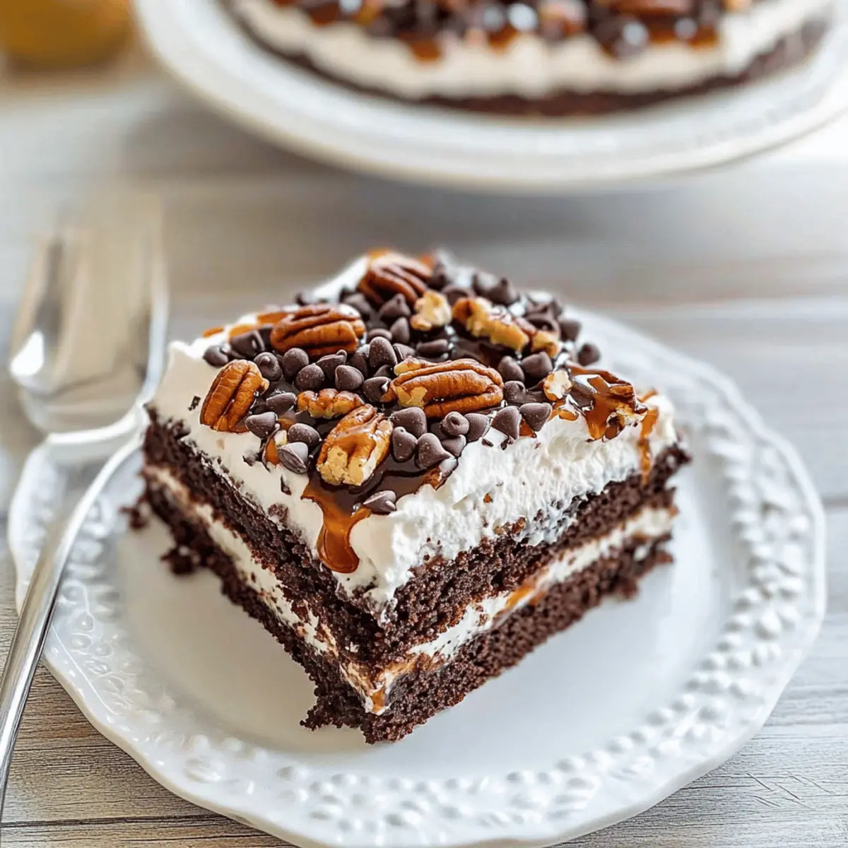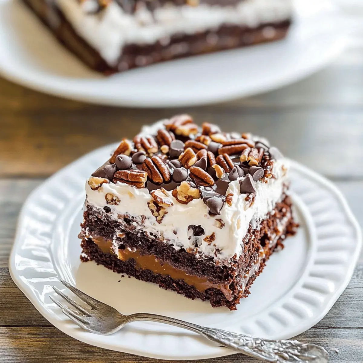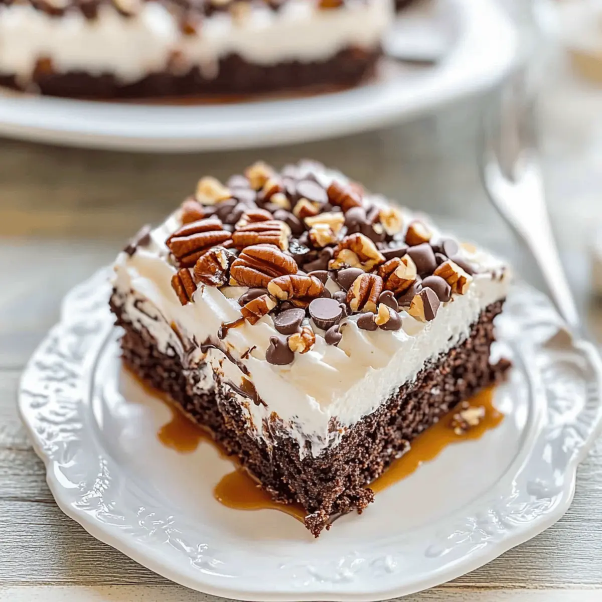 As I rummaged through my pantry, the remnants of ingredients whispered to me, begging to be transformed into something magical. This is how my Easy Turtle Chocolate Poke Cake came to life—an indulgent treat that perfectly marries rich chocolate with gooey caramel. It’s a dessert that not only dazzles at any gathering but is also a breeze to prepare with just a handful of everyday ingredients. The moist texture literally melts in your mouth, making it a comforting choice for those craving a sweet escape from routine. Plus, with its playful blend of creamy whipped topping, crunchy pecans, and mini chocolate chips, it’s hard to resist going back for seconds! Ready to create a slice of bliss that will impress friends and family alike? Let’s dive in! Why is Turtle Chocolate Poke Cake a must-try? Decadent Chocolate Delight: This Turtle Chocolate Poke Cake combines rich devil’s food chocolate with luscious caramel, creating a dessert that is sinfully satisfying. Effortlessly Simple: With just a few basic ingredients and minimal prep time, anyone can whip this up—perfect for busy weeknights or unexpected guests. Crowd-Pleasing Choice: Ideal for parties, gatherings, or family celebrations, this cake’s irresistible flavor profile will have everyone coming back for more. Moist and Flavorful: The poke method ensures every bite is infused with sweetness, while the crunchy nuts and chocolate chips add delightful texture. Versatile Variations: Feeling adventurous? Try swapping in a German chocolate mix or adding toffee bits for a unique twist. Elevate your dessert game with this cake and consider pairing it with other favorites like Bake Oreo Cheesecake or refreshing Bake Summer Cake for an unforgettable treat spread! Turtle Chocolate Poke Cake Ingredients • Gather these everyday essentials to whip up a delicious Turtle Chocolate Poke Cake that everyone will love! For the Cake Devil’s Food Chocolate Cake Mix – this box mix offers a wonderfully rich chocolate flavor; you can opt for a homemade chocolate cake instead. For the Poke Filling Sweetened Condensed Milk – adds moisture and sweetness, creating that signature poke cake texture. Caramel Sundae Topping – provides mouthwatering caramel goodness; feel free to use homemade caramel sauce in its place! For the Topping Whipped Topping – perfect for a creamy texture; a fat-free version is great for fewer calories. Chopped Pecans – these add a delightful crunch and enhance the caramel flavor. Mini Semi-Sweet Chocolate Chips – boosts the chocolate experience and adds texture; you can choose full-size chocolate chips if you prefer. For Drizzling Salted Caramel Sauce – drizzling this on top elevates flavor and presentation; adjust the amount to your taste! Step‑by‑Step Instructions for Turtle Chocolate Poke Cake Step 1: Preheat and Prepare the Pan Begin by preheating your oven to 350°F (175°C). While it’s warming up, line a 9×13 inch baking pan with aluminum foil, leaving some overhang for easy removal later. Lightly spray the foil with cooking spray to prevent sticking. This simple preparation ensures your Turtle Chocolate Poke Cake will come out perfectly! Step 2: Bake the Cake Prepare the cake mix according to the package instructions, typically involving mixing the cake mix with water, eggs, and oil until smooth. Pour the batter into the prepared pan and bake for 28-32 minutes, or until a toothpick inserted in the center comes out clean. Keep an eye on it and check for doneness 5 minutes earlier to avoid dryness. Step 3: Create the Poke Holes Once the cake is baked to perfection, remove it from the oven and allow it to cool for about 10 minutes. Use the handle of a wooden spoon to poke holes generously across the entire cake, aiming for even spacing to let the delicious fillings seep in. Your Turtle Chocolate Poke Cake will be extra flavorful thanks to this crucial step! Step 4: Make the Poke Filling In a medium bowl, whisk together the sweetened condensed milk and caramel sundae topping until well combined. Once your cake has the holes, pour the sweetened condensed milk and caramel mixture evenly over the surface, making sure to get it into all the holes. This will infuse your cake with rich, sweet flavors as it cools. Step 5: Chill the Cake Place the cake in the refrigerator and let it chill for about 10 minutes. This brief cooling time helps the flavors meld beautifully, ensuring every slice of your Turtle Chocolate Poke Cake is moist and decadent. While it’s chilling, prepare to add the topping! Step 6: Top with Whipped Topping After chilling, remove the cake from the refrigerator and spread the thawed whipped topping evenly across the top. Be generous—this creamy layer balances the rich chocolate and caramel flavors wonderfully. Then, sprinkle with the chopped pecans and mini semi-sweet chocolate chips, creating a delightful crunch and an appealing look. Step 7: Final Chill Cover the assembled Turtle Chocolate Poke Cake with plastic wrap or aluminum foil and refrigerate for at least 2 hours; an overnight chill is even better! This allows your cake to soak up the caramel goodness and helps the flavors develop. Your patience will be rewarded when you serve it at your next gathering. Step 8: Drizzle and Serve Just before serving, drizzle the salted caramel sauce over the top of the chilled cake for that beautiful finishing touch. Slice into squares and share this sublime Turtle Chocolate Poke Cake with family and friends. The rich chocolate, caramel, and crunchy toppings will be a hit at any occasion! What to Serve with Turtle Chocolate Poke Cake? Enhance your dessert experience by pairing your Turtle Chocolate Poke Cake with delicious sides that complement its rich flavors. Tall Glass of Milk: A classic pairing that balances richness with a refreshing sip—perfect for every chocolate lover. Vanilla Ice Cream: Serves as a creamy contrast to the chocolate and caramel; a scoop will elevate each bite. Fresh Ber