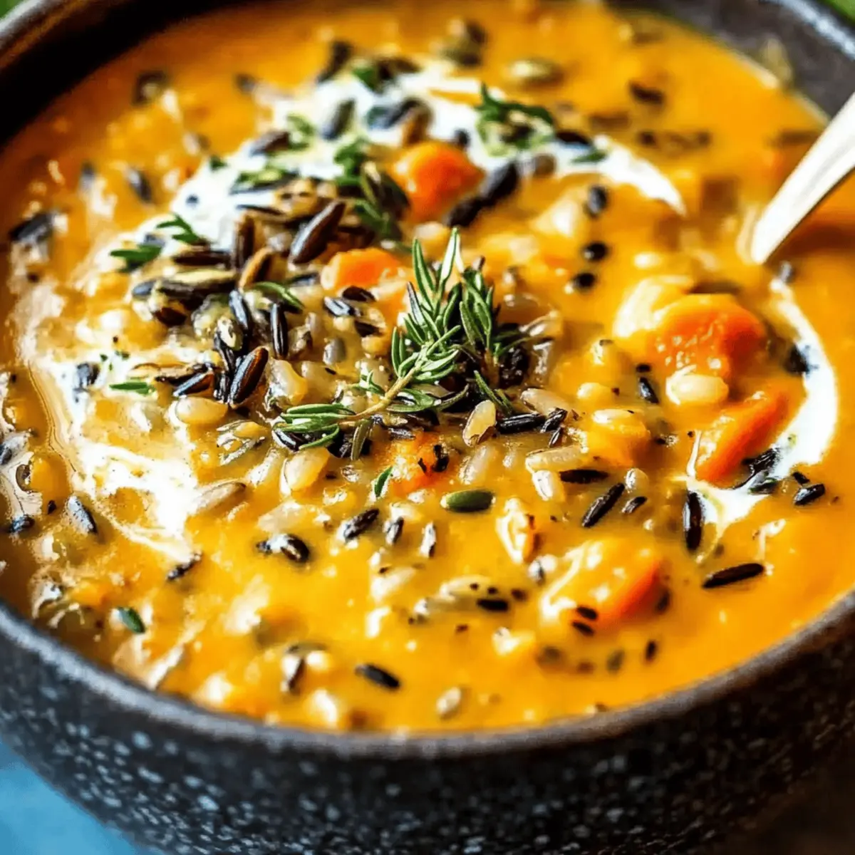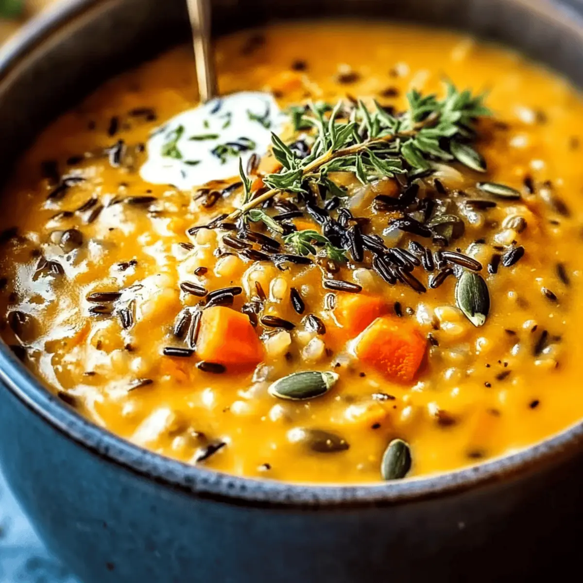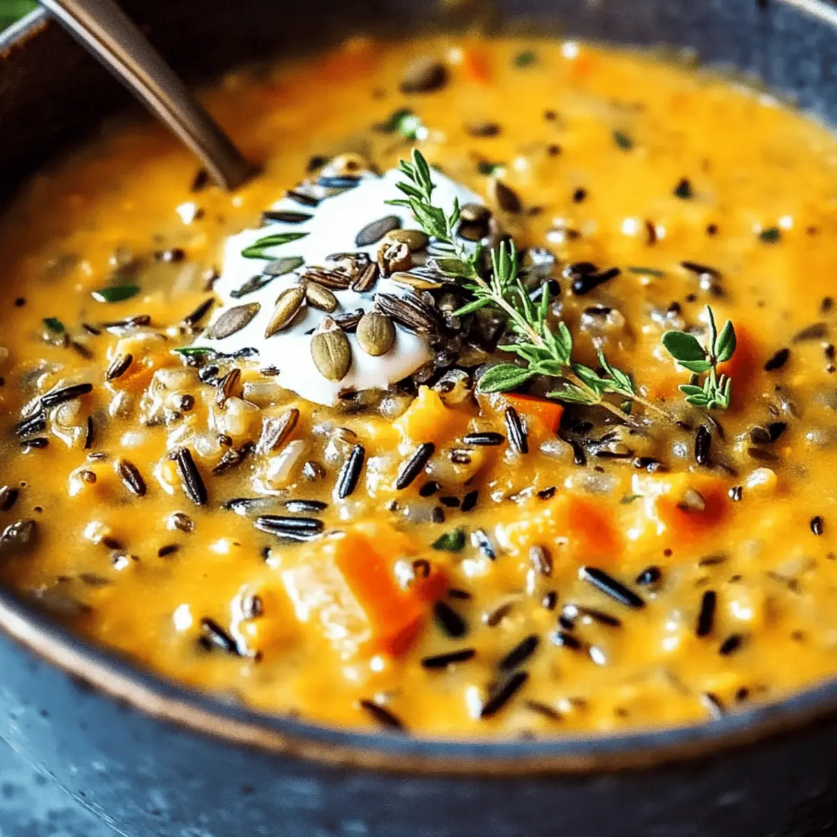 As the leaves turn golden and the air crispens, there’s something magical about cozying up with a warm bowl of Vegan Pumpkin Wild Rice Soup. This nourishing dish combines the earthy allure of wild rice with the rich, creamy texture of pumpkin and coconut milk. With aromatic spices dancing through the air, it transforms your kitchen into a comforting haven, making it the perfect vegan comfort food for those chilly autumn nights. Plus, it’s both quick to prepare and a delightful crowd-pleaser, suitable for family dinners or festive gatherings. Are you ready to dive into this cozy concoction that will truly embrace the essence of fall? Why is this soup a fall favorite? Comforting Warmth: Delight in the cozy embrace of this soup, perfect for chilly autumn evenings. Nutritious Goodness: Packed with vitamins and fiber, it’s a healthy choice that feels indulgent without the guilt. Versatile Variations: Spice it up with options like Spicy Pumpkin Wild Rice Soup or a rich Coconut Curry twist for exciting flavors. Quick and Easy: With straightforward steps, this recipe is ideal for busy weeknights or last-minute gatherings, allowing you to savor homemade flavor effortlessly. Crowd-Pleasing Appeal: Whether served at dinner or during a holiday feast, this soup is sure to impress and satisfy guests of all ages. Pair it with a side of crusty bread or try it alongside a comforting dish like Cheesy Hamburger Rice for a complete meal. Vegan Pumpkin Wild Rice Soup Ingredients For the Soup Base • Olive Oil – Provides fat for sautéing vegetables; avocado oil makes a great substitute. • Yellow Onion – Adds foundational flavor and sweetness when cooked down. • Carrots – Contributes natural sweetness and texture; sweet potatoes can be used for added depth. • Celery – Offers crunch and aroma; celery root can serve as an alternative. • Garlic – Enhances umami and savory notes; always opt for fresh over powdered. For Flavoring • Dried Thyme – Provides an earthy flavor; fresh thyme is a suitable substitute. • Dried Sage – Imparts a warm, herbaceous note; can be replaced by oregano if needed. • Red Pepper Flakes (optional) – Introduces a hint of heat; fresh jalapeño gives a spicier kick. For the Soup Body • Vegetable Broth – Acts as the soup base; homemade options yield more flavor—choose low-sodium for salt control. • Pumpkin Puree – Provides creaminess and natural sweetness; ensure it’s not pumpkin pie filling for accurate flavor. • Cooked Wild Rice – Adds chewy texture and nutty flavor; quinoa serves as a gluten-free alternative. • Coconut Milk – Contributes a creamy texture and healthy fats; use light coconut milk or cashew cream for a lighter option. For Added Flavor • Nutritional Yeast – Adds a cheesy flavor and B vitamins; can be omitted for allergy concerns. • Maple Syrup (or Agave Nectar) – Enhances the soup’s natural sweetness; honey is an alternative for non-vegans. • Apple Cider Vinegar – Balances flavors with acidity; lemon juice can substitute in a pinch. • Salt and Pepper – Essential for seasoning; adjust to taste. Optional Toppings • Toasted Pumpkin Seeds – Adds a delightful crunch. • Fresh Parsley – Offers a bright garnish. • Swirl of Coconut Cream – Elevates creaminess for richness; perfect for a special touch. Dive into this cozy bowl of deliciousness, and you’ll soon see why the Vegan Pumpkin Wild Rice Soup is a beloved autumn staple! Step‑by‑Step Instructions for Vegan Pumpkin Wild Rice Soup Step 1: Sauté the Vegetables In a large pot, heat 2 tablespoons of olive oil over medium heat. Once shimmering, add diced yellow onion, chopped carrots, and celery. Sauté these aromatic vegetables for about 5-7 minutes until they soften and turn translucent, filling your kitchen with inviting scents. This base will enhance the flavor of your Vegan Pumpkin Wild Rice Soup. Step 2: Add Garlic and Herbs Stir in minced garlic, dried thyme, and dried sage, along with a pinch of red pepper flakes if you want some heat. Cook for an additional minute, allowing the garlic and herbs to release their fragrances and toast lightly. This step builds the savory notes that will make your soup truly delightful. Step 3: Incorporate the Broth Pour in 6 cups of vegetable broth and scrape any browned bits from the bottom of the pot. This acts as an essential flavor booster for your Vegan Pumpkin Wild Rice Soup. Bring the mixture to a gentle simmer; watch for small bubbles around the edges of the pot, which will take about 2-3 minutes. Step 4: Mix in Pumpkin and Rice Add 1 cup of pumpkin puree and 1 cup of cooked wild rice to the pot, stirring well to combine everything. The soup will begin to take on a beautiful orange hue, making it visually appealing. Allow the mixture to simmer gently for 15-20 minutes, stirring occasionally, until everything is heated through and aromatic. Step 5: Cream it Up Lower the heat slightly before adding 1 can of coconut milk, along with 2 tablespoons of nutritional yeast, 1 tablespoon of maple syrup, and 1 tablespoon of apple cider vinegar. Mix thoroughly, incorporating the creamy element that enriches the soup’s texture. For optimal creaminess, avoid letting the soup boil vigorously after this step. Step 6: Final Seasoning Taste your soup and season with salt and freshly ground black pepper to your preference. Let it simmer for an additional 5 minutes, allowing the flavors to meld beautifully. The Vegan Pumpkin Wild Rice Soup should now have a rich and balanced flavor profile, ready to delight your taste buds. Step 7: Serve and Garnish Remove the pot from the heat and let the soup cool slightly before ladling it into bowls. Garnish with toasted pumpkin seeds, fresh parsley, or a swirl of coconut cream if desired. This adds an appealing texture and visual charm to finish off your comforting dish perfectly. Expert Tips for Vegan Pumpkin Wild Rice Soup • Homemade Broth: Use homemade vegetable broth f