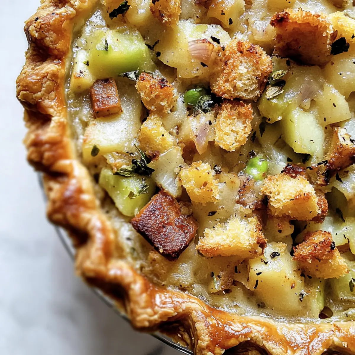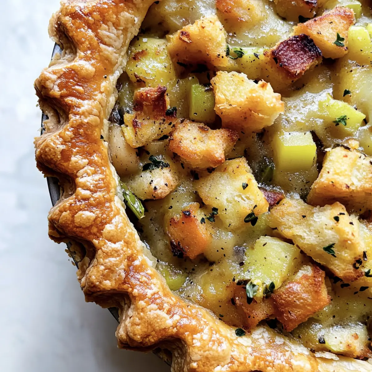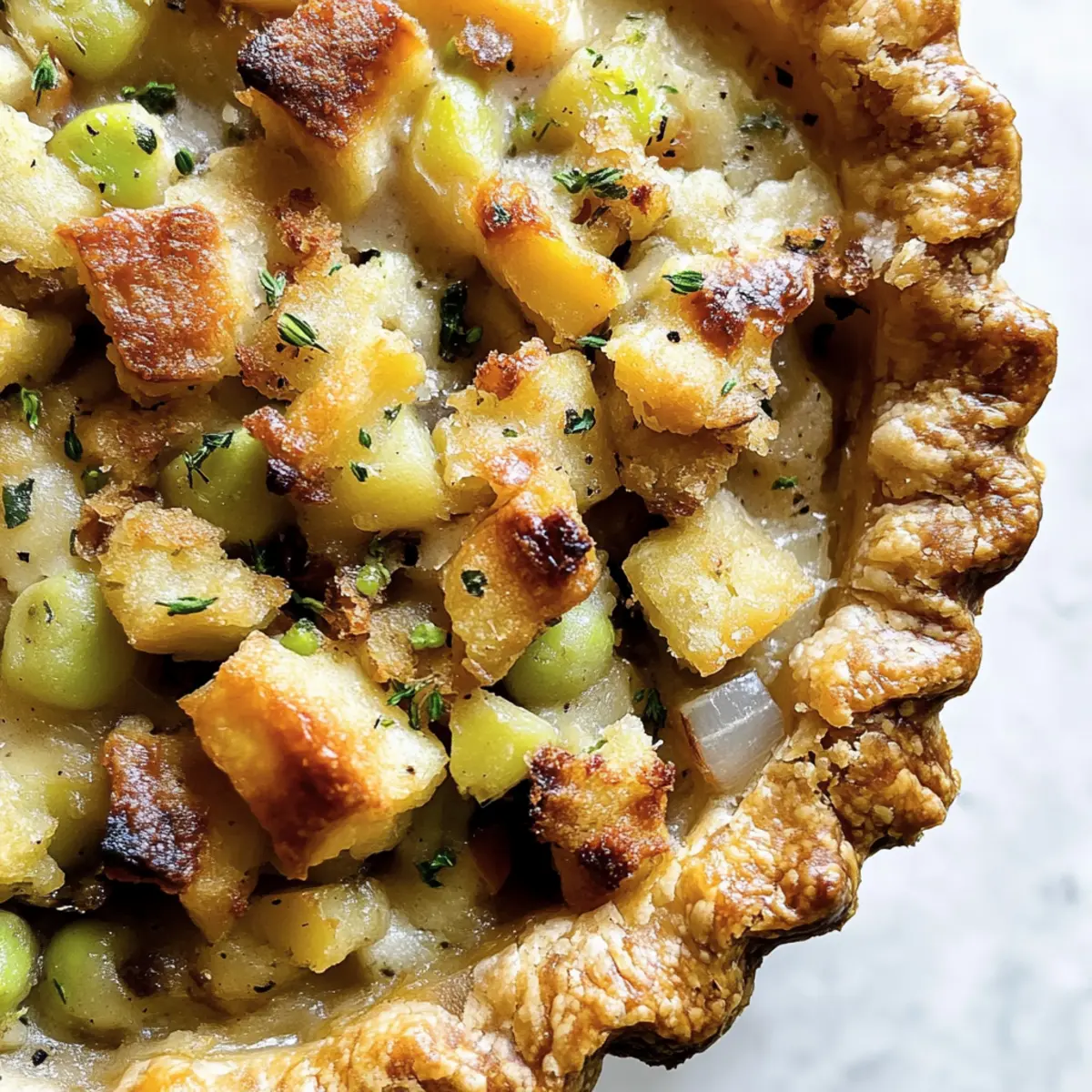 As the leaves turn golden and the air fills with a crisp chill, I can’t help but crave the cozy comfort of a home-cooked meal. This Thanksgiving, I’m excited to share my Vegan Thanksgiving Pot Pie with Savory Stuffing, a heartwarming dish that perfectly embraces the festive spirit. Not only is it a delightful centerpiece for your holiday table, but it also caters to both vegans and non-vegans alike, ensuring everyone leaves with a satisfied smile. This recipe is an effortless way to impress your guests with hearty flavors while also being a fantastic option for meal prep—making it even easier to enjoy the season. Ready to dive into a plate of nostalgia and warmth? Let’s make something delicious together! Why Is This Pot Pie So Special? Comforting and inviting, this Vegan Thanksgiving Pot Pie is the epitome of home-cooked love. Unique flavors from savory chick’n and fresh vegetables dance together under a crispy stuffing crust. Simple prep makes it a breeze for even the busiest cooks—perfect for Thanksgiving gatherings or cozy family dinners. Versatile options allow you to tailor the filling to your taste, whether you wish to try a One Pot Smoked dish or experiment with additional veggies like mushrooms. Plus, it’s a great way to use your leftover stuffing, minimizing waste while maximizing flavor! Vegan Thanksgiving Pot Pie Ingredients For the Pie Crust • Vegan Pie Crust – Use store-bought or homemade; it serves as the delightful base for the filling. For the Filling • Vegan Chick’n Pieces – Try Gardein brand for a delicious, meaty texture; it’s perfect in this vegan Thanksgiving pot pie. • Carrots – Fresh or frozen, they add sweetness and vibrant color to the filling. • Celery – Fresh celery contributes a satisfying crunch and fresh flavor. • Onion – Diced onion enhances the overall taste and aroma of the dish. • Minced Garlic – A must for depth of flavor; use fresh for the best results. • Vegan Butter – Ideal for sautéing vegetables and imparting richness. • All-Purpose Flour – Acts as a thickener; swap for gluten-free flour if needed. • Kosher Salt & Black Pepper – Essential seasonings to elevate the flavor profile. • Dried Thyme Leaves – Infuse earthy notes into the filling to enhance its savory goodness. • Vegan Vegetable Broth – Serves as the flavor-rich base for the sauce. • Frozen Peas – They provide a hint of sweetness and a lovely pop of color. • Vegan Heavy Cream – Adds creaminess; can substitute with cashew cream or diluted vegan sour cream. For the Topping • Vegan Stuffing – The pièce de résistance! Use homemade or store-bought for a flavorful topping. Step‑by‑Step Instructions for Vegan Thanksgiving Pot Pie Step 1: Preheat the Oven Begin by preheating your oven to 375°F (190°C). This ensures a perfectly baked crust later on. Prepare your workspace for the Vegan Thanksgiving Pot Pie by gathering necessary tools, including a rolling pin, a 9-10” pie dish, and a skillet, making sure everything is ready to go. Step 2: Prepare the Pie Crust Roll out your vegan pie crust to fit the pie dish. Place the crust into the dish, gently pressing it down to avoid air pockets. Trim any excess crust hanging over the edges, and set it aside while you create the filling, ensuring a solid base for the savory goodness to come. Step 3: Sauté the Vegetables In a skillet over medium heat, melt a generous tablespoon of vegan butter. Add diced onions, sliced carrots, and chopped celery. Sauté for about 5–7 minutes until they soften and start to caramelize, filling your kitchen with a warm, inviting aroma. Stir occasionally to prevent burning. Step 4: Add Garlic Once your vegetables are tender, stir in the minced garlic and cook for an additional minute. This melds the flavors together beautifully, enhancing the base of your Vegan Thanksgiving Pot Pie. The aroma will be irresistible as the garlic turns fragrant and golden. Step 5: Create the Roux Sprinkle in all-purpose flour, stirring continuously to create a roux. Gradually pour in your vegan vegetable broth, whisking until the mixture thickens. This should take about 3–5 minutes. The filling will become creamy and rich, enhancing the overall texture of your pot pie. Step 6: Fold in Chick’n and Peas Remove the skillet from heat and gently fold in the vegan chick’n pieces, frozen peas, dried thyme, salt, and black pepper. Make sure everything is evenly coated with your flavorful sauce. The vibrant colors and hearty ingredients will make your Vegan Thanksgiving Pot Pie truly inviting. Step 7: Assemble the Pot Pie Pour the filling into the prepared pie crust, spreading it out evenly. Don’t skip this step; the filling needs a good distribution for each bite to be delicious. Next, generously top the filling with your vegan stuffing, putting a delightful, crispy layer atop your savory mixture. Step 8: Bake the Pot Pie Carefully place the assembled pot pie in your preheated oven and bake for 30–35 minutes. You’ll know it’s ready when the crust turns golden brown and the stuffing is bubbling slightly. Your kitchen will smell heavenly as the pie cooks. Step 9: Let It Cool Once baked, remove the Vegan Thanksgiving Pot Pie from the oven and let it cool for about 10 minutes. This resting period allows the filling to set, making slicing easier and enhancing each savory bite. The anticipation will build as the rich aroma wafts through your home. How to Store and Freeze Vegan Thanksgiving Pot Pie Room Temperature: Keep the pot pie covered at room temperature for up to 2 hours after baking to prevent any spoilage before serving. Fridge: Store leftover Vegan Thanksgiving Pot Pie in an airtight container in the fridge for up to 3 days. Reheat slices in the oven for the best texture. Freezer: You can freeze the assembled, unbaked pot pie for up to 2 weeks. Wrap it tightly in plastic wrap and foil to avoid freezer burn. Reheating: Thaw the frozen pie in the refrigera