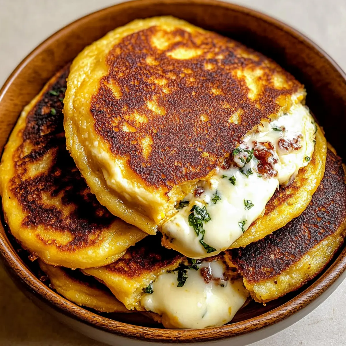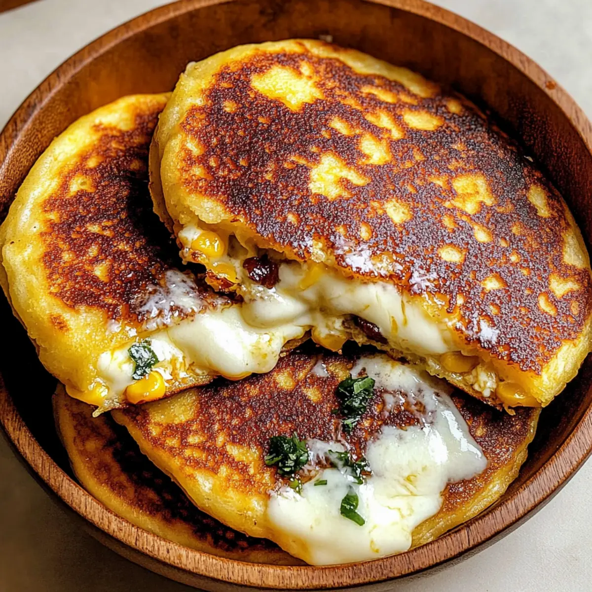 Facebook Twitter Pinterest LinkedInAs I flipped the golden pancakes, the sweet, buttery aroma filled my kitchen, instantly transporting me to bustling Venezuelan markets where the air is rich with the scent of delicious street food. Today, I’m excited to share my take on Venezuelan Sweet Corn Cachapas with Melty Mozzarella. These delightful corn pancakes are not only easy to whip up, making them perfect for a quick snack or a cozy breakfast, but they also offer a satisfyingly creamy center thanks to the delicious mozzarella. Whether you’re looking for a comforting meal that pleases the whole family or a vegetarian treat to impress friends, these cachapas bring a bit of Venezuelan charm right to your dinner table. Ready to elevate your cooking game with this warm and flavorful dish? Let’s dive in! Why Are Cachapas Perfect for You? Comforting, these Venezuelan Sweet Corn Cachapas are like a warm hug on a plate, perfect for any time of the day. Simplicity is key; you only need a handful of ingredients and a blender to whip them up! Flavorful, the sweet corn combines beautifully with rich mozzarella for an irresistible taste, making them a hit with everyone. Versatile, you can customize fillings easily—swap in queso fresco or add bacon for a savory twist. Plus, make-ahead friendly, these cachapas freeze well, allowing you to enjoy homemade comfort food anytime. Enjoy them solo or with toppings like honey or avocado slices for the ultimate snack experience! Venezuelan Sweet Corn Cachapas Ingredients For the Batter Sweet Corn – Main ingredient providing sweetness; fresh or thawed frozen corn works best. Egg – Adds moisture and structure to hold the batter together. All-Purpose Flour – Helps bind ingredients; substitute with gluten-free flour for a different texture. Salt – Enhances flavor and balances the overall sweetness. Granulated Sugar – Adds a hint of sweetness; feel free to replace with honey for a floral twist. For Frying Vegetable Oil – Essential for frying to create a crispy golden exterior. Unsalted Butter – Adds richness when served; top each cachapa for an extra flavor boost. For the Filling Buffalo Mozzarella Cheese – Melts beautifully, providing a creamy center; can be replaced with queso fresco or plant-based cheese if preferred. With these ingredients, you’re on your way to making delicious Venezuelan Sweet Corn Cachapas that will delight your taste buds and warm your heart! Step‑by‑Step Instructions for Venezuelan Sweet Corn Cachapas Step 1: Batter Preparation In a blender, combine the sweet corn, egg, flour, salt, and sugar. Blend on medium speed until the mixture is mostly smooth but still retains some chunky corn texture, about 30-45 seconds. This will create a flavorful base for your Venezuelan Sweet Corn Cachapas. Scrape down the sides of the blender if needed, ensuring all ingredients are well incorporated. Step 2: Preheat the Skillet Heat 2 tablespoons of vegetable oil in a non-stick skillet over medium heat. Once the oil is shimmering (about 2-3 minutes), it’s ready for frying. This step is crucial; achieving the right temperature ensures your cachapas will have that beautiful golden-brown exterior. Step 3: Cooking the Cachapas Spoon approximately 60 ml of batter per cachapa onto the skillet, shaping them into circles about 4-5 inches wide. Cook for 3-4 minutes on one side, or until the edges begin to look set and the underside is golden brown. Flip carefully and cook the other side for an additional 3-4 minutes. Repeat this process for all batter, adding more oil as needed. Step 4: Filling with Mozzarella Once the cachapas are cooked, place slices of mozzarella cheese in the center of each one. Fold the cachapa in half over the cheese to create a pocket, letting the residual heat melt the cheese inside. Ensure the cachapas are warm for about 1-2 minutes, which will allow the mozzarella to reach that perfect gooey consistency. Step 5: Serving Transfer the filled cachapas to a serving plate and top each with a pat of unsalted butter for an added richness. Serve immediately for the best flavor, optionally alongside dipping sauces or honey for a touch of sweetness. These Venezuelan Sweet Corn Cachapas are perfect for any meal or snack time, offering delightful warmth and comfort. Storage Tips for Venezuelan Sweet Corn Cachapas Room Temperature: Enjoy fresh cachapas immediately for the best flavor; they can be kept at room temperature for up to 2 hours before they should be refrigerated. Fridge: Unfilled cachapas can be stored in an airtight container in the fridge for up to 3 days. Reheat in a skillet or microwave, ensuring they remain moist. Freezer: These cachapas freeze beautifully! Stack unfilled cachapas with parchment paper between each layer, seal in a freezer bag, and store for up to 1 month. Reheat directly from frozen for a quick and delicious meal. Reheating: If reheating filled cachapas, use a skillet over low heat to ensure the cheese melts without drying out the corn cake. Enjoy the warm, comforting flavors of your Venezuelan Sweet Corn Cachapas! Expert Tips for Perfect Cachapas Fresh Ingredients: Use freshly shucked corn for the best flavor and texture; frozen corn works too but may lack the same sweetness. Right Consistency: Blend the batter until it’s mostly smooth, but leave some corn texture for delightful bites in every cachapa. Avoid Sticky Situations: Ensure your skillet is hot enough before adding the batter to achieve that perfect golden crust without sticking. Folding Technique: Wait until the cachapas are cooked through before folding them—this ensures the cheese melts perfectly inside. Storing Leftovers: Wrap any unfilled cachapas tightly in plastic wrap and refrigerate for up to three days; reheat in a skillet for the best results. Flavor Variations: Experiment with fillings like queso fresco, or add cooked bacon for a savory twist on these already delicious Venezuelan Sweet Corn Cachapas! What to Serve with