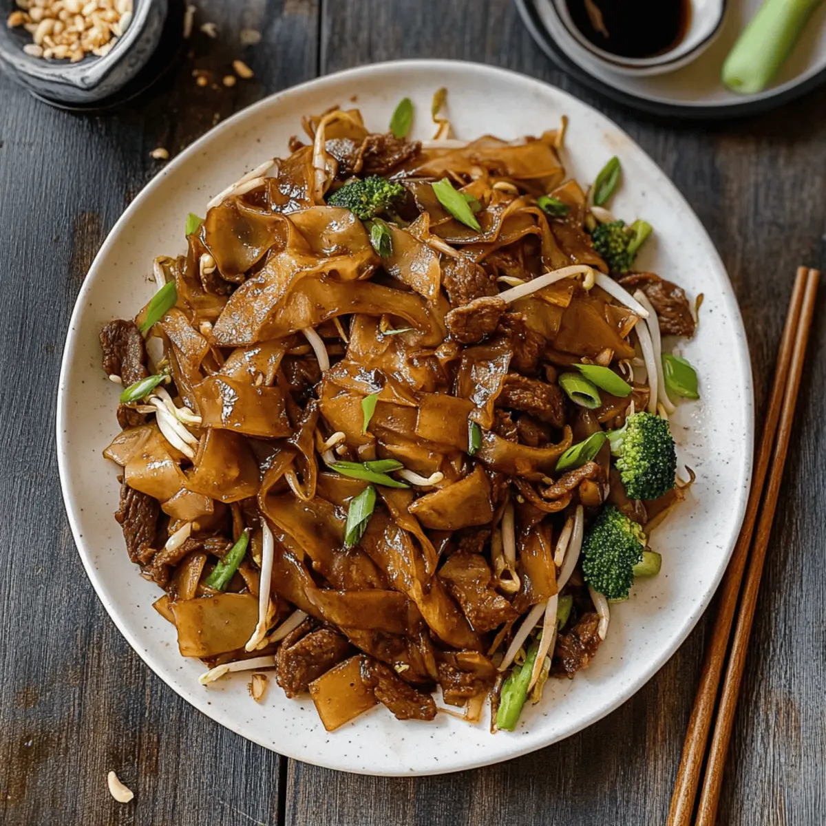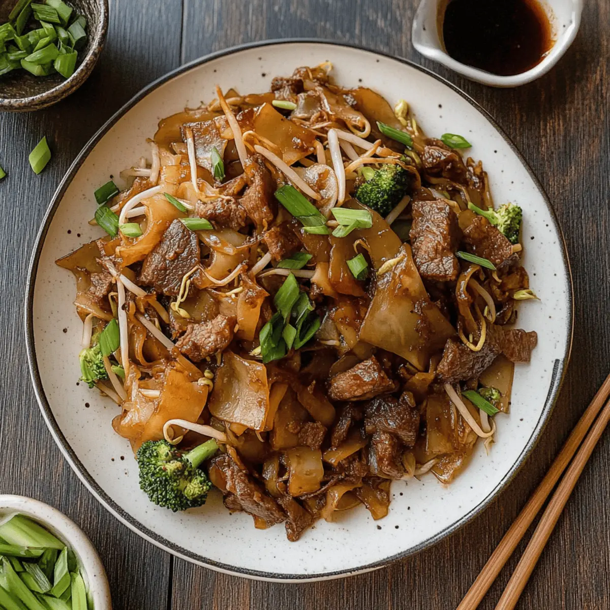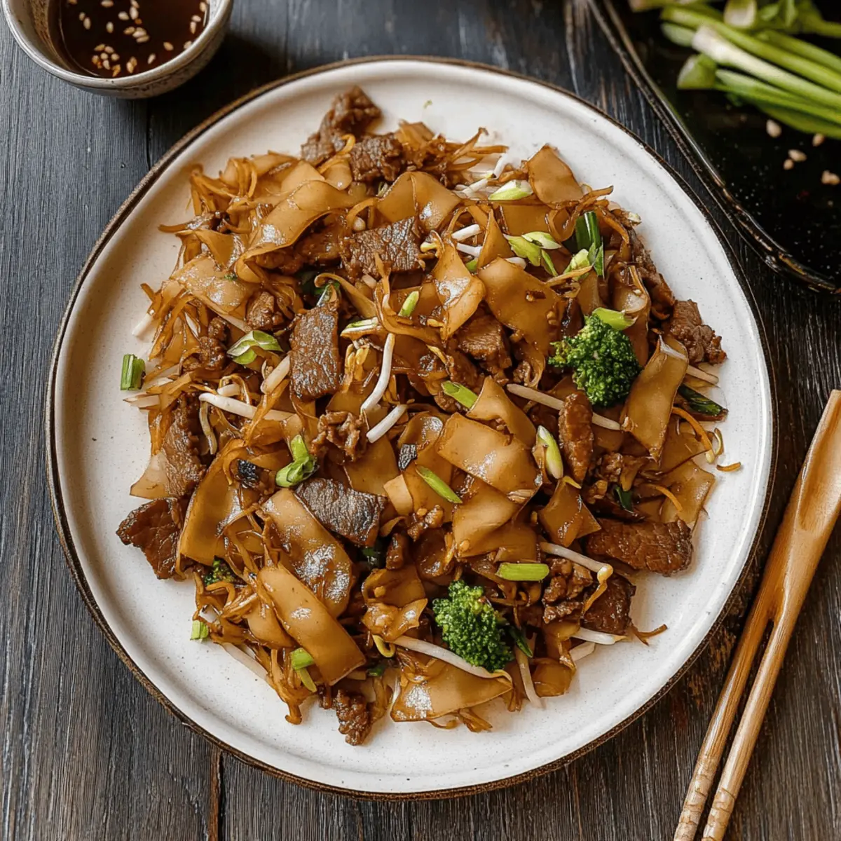 Standing in my kitchen on a bustling weeknight, the aroma of sizzling garlic and savory beef filled the air, instantly transporting me to the vibrant streets of Vietnam. That’s when I knew I had to share my favorite comfort food: Vietnamese Flat Rice Noodles with Beef, or Hu Tieu Ap Chao. This dish effortlessly combines chewy, wide rice noodles and tender beef in a sweet and umami-rich sauce, providing both a quick meal and a heartwarming family experience. Not only is it family-friendly, making it a hit with all ages, but it also comes together in a flash, perfect for those evenings when you crave something delicious without the fuss. Ready to dig into this scrumptious stir-fry? Let’s dive into the recipe and experience the joy of homemade Vietnamese flavors together! Why Try Vietnamese Flat Rice Noodles? Comforting and Flavorful: This dish offers the perfect blend of chewy noodles and savory beef, making it a cozy family favorite. Quick Preparation: Whip it up in just 30 minutes, ideal for busy weeknights when time is tight. Savory Sauce: The umami-rich sauce elevates every bite, transforming simple ingredients into an unforgettable meal. Versatile Ingredients: Swap in chicken or tofu for diverse protein options, and use your choice of veggies to customize it to your taste. Crowd-Pleaser: This dish will impress friends and family alike, ensuring everyone leaves the table satisfied. Whether you’re feeling adventurous or just want a comforting meal, this Hu Tieu Ap Chao is the way to go! Enjoy with a side of lime wedges, and for more Asian-inspired dishes, check out my Chicken Scampi Rice or Ground Beef Potatoes. Vietnamese Flat Rice Noodles with Beef Ingredients For the Sauce • Oyster Sauce – Adds umami flavor; substitute with soy sauce for a vegetarian option. • Soy Sauce – Provides saltiness and depth; use low-sodium soy sauce to control salt levels. • Dark Soy Sauce – Adds richness and color; can replace with additional regular soy sauce, but flavor and color may vary. • Granulated Sugar – Sweetens and balances the sauce; brown sugar offers a deeper flavor. • Pepper – Adds mild heat; swap with white pepper for a different taste. • Sriracha (optional) – Provides spice; omit for a milder dish. For the Beef • Thinly Sliced Beef (skirt, flap, flank, or ribeye) – Main protein source; chicken or tofu are also great alternatives. • Baking Soda – Tenderizes the beef for improved texture; not needed for already tender cuts. • Garlic Powder – Depth of flavor; fresh minced garlic can be substituted for a more potent taste. For the Vegetables • Onion (¼ sliced) – Enhances the dish’s aroma; shallots are a suitable substitute. • Chinese Broccoli (Gai Lan) – Adds a fresh, slightly bitter crunch; regular broccoli can be used instead. • Bean Sprouts (1 cup) – Provides crunch; substitute with shredded carrots for variety. • Green Onion – Adds freshness and garnish; regular onion can replace if necessary. For the Noodles • Rice Noodles (1 lb) – The main carbohydrate; can use dried or fresh and follow cooking instructions accordingly. • Cooking Oil – Essential for frying; avocado oil is recommended for its high smoke point. Now that you have everything ready, prepare to dive into the flavors of Vietnamese Flat Rice Noodles with Beef! Enjoy creating a satisfying meal that will transport your taste buds straight to Vietnam! Step‑by‑Step Instructions for Vietnamese Flat Rice Noodles with Beef Step 1: Prepare the Sauce In a medium bowl, whisk together 3 tablespoons of oyster sauce, 2 tablespoons of soy sauce, 1 tablespoon of dark soy sauce, 1 tablespoon of granulated sugar, and a pinch of pepper. If you enjoy a bit of heat, add a teaspoon of Sriracha. Set the sauce aside while you prepare the rest of your ingredients for the Vietnamese Flat Rice Noodles with Beef. Step 2: Marinate the Beef In a large bowl, toss the thinly sliced beef with a sprinkle of baking soda, 1 teaspoon of garlic powder, and about half of the prepared sauce. Ensure the beef is well-coated, then let it marinate for 15-20 minutes. This step is crucial as the baking soda helps tenderize the beef, enhancing the texture for your stir-fry. Step 3: Cook the Beef Preheat a large skillet or wok over medium-high heat and add 2 tablespoons of cooking oil. Once the oil is shimmering, add the marinated beef, spreading it in a single layer in the pan. Sear the beef for 1-2 minutes until it is slightly pink; then, remove it from the pan and set it aside. This will ensure the beef stays juicy and flavorful in your Vietnamese Flat Rice Noodles with Beef. Step 4: Sauté the Vegetables In the same skillet, add another tablespoon of oil if needed, and toss in the sliced onion and chopped Chinese broccoli. Sauté for about 2 minutes, stirring frequently, until the vegetables are tender yet vibrant. The aroma will fill your kitchen, hinting at the delicious Vietnamese flavors that are coming together. Step 5: Add Noodles Now, add the cooked rice noodles to the skillet with the sautéed vegetables. Drizzle in half of the remaining sauce and toss everything together for 1-2 minutes over medium heat. As the noodles begin to soften and absorb the sauce, they will take on a beautiful, glossy appearance, signaling it’s time to bring all the elements together in your Vietnamese Flat Rice Noodles with Beef. Step 6: Combine Ingredients Carefully fold in the bean sprouts along with the rest of the sauce you set aside earlier. Continue to cook for another 2 minutes, stirring until everything is well combined and heated through. The combination of noodles, beef, and crunchy vegetables will create a delightful mix of textures and flavors. Step 7: Finish the Dish Finally, return the cooked beef along with any accumulated juices back to the skillet. Toss everything together gently and season with additional soy sauce or pepper to taste, allowing it to rest for 1-2 minutes off the heat. This final 