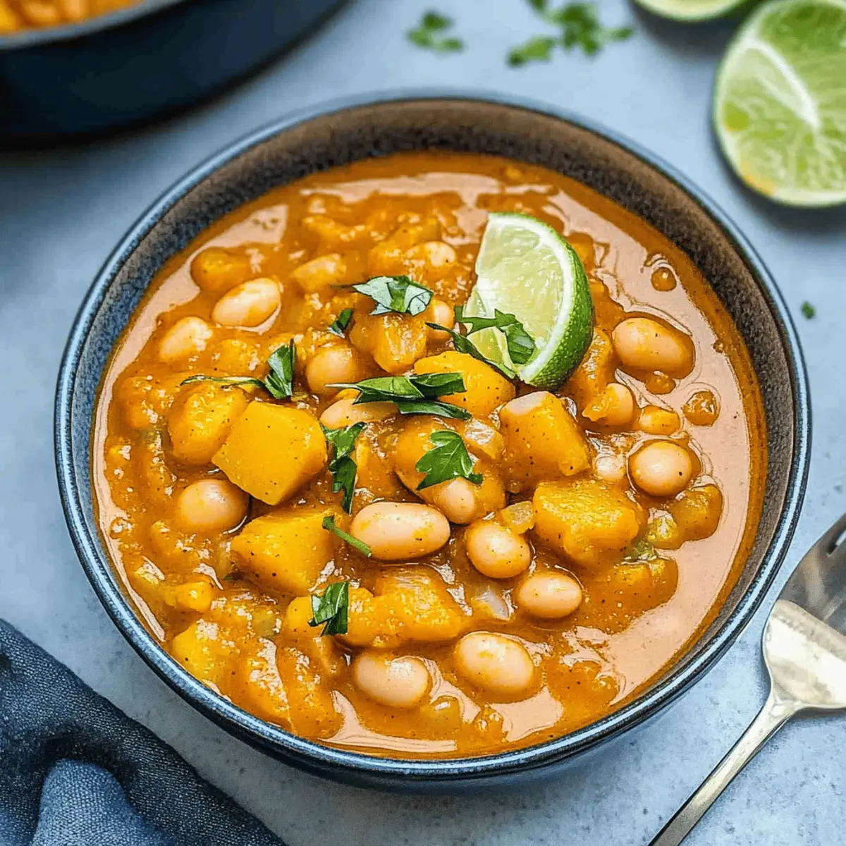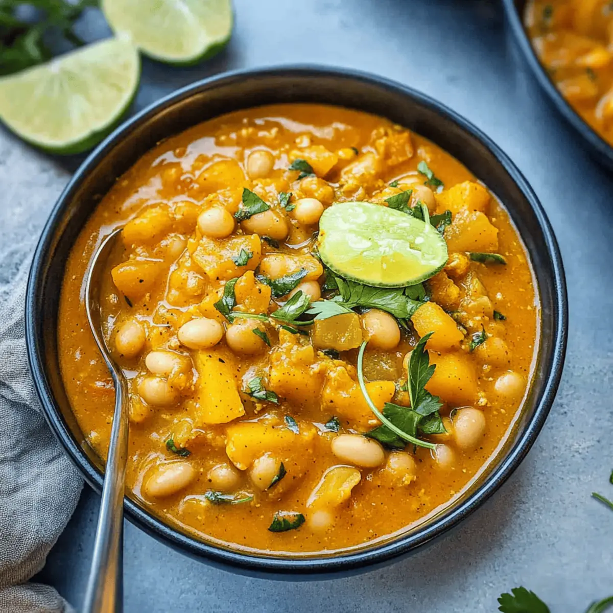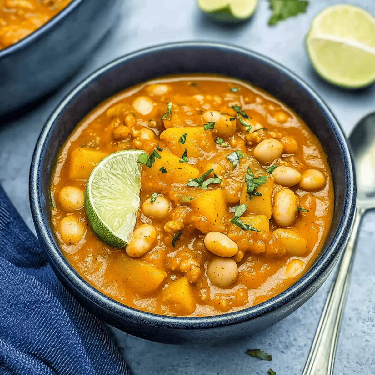 As autumn whispers through the trees, I find myself craving warm, comforting meals that hug me from the inside out. That’s where my creamy White Bean Pumpkin Chili comes into play—a delightful dish that merges the natural sweetness of pumpkin with the smoky richness of paprika. This recipe isn’t just a one-pot wonder; it’s also incredibly versatile and packed with protein, making it a healthy choice. Whether you’re stirring in ground turkey for a hearty twist or opting for the vegetarian route with a boost of beans, this chili is designed to please everyone at the table. Plus, it’s quick to prepare, which means less time in the kitchen and more time enjoying the cozy company of family and friends. Ready to savor a bowl of warmth that’s sure to become a staple this season? Let’s dive in and create some delicious memories together! Why is this chili a must-try? Warm, Cozy Comfort: This creamy White Bean Pumpkin Chili wraps you in a delightful hug with every spoonful, making it the perfect companion for chilly evenings. Versatile and Customizable: Whether you prefer ground turkey, chicken, or even a vegetarian twist with extra beans, this recipe caters to all dietary preferences. Quick and Easy: With minimal prep and cooking times, you can whip up this hearty dish from stove to table in no time, freeing you to enjoy moments with loved ones. Nutty Depth: The addition of peanut butter brings an unexpected twist, adding layers of flavor that elevate this chili beyond the ordinary. For even more festive ideas, check out my Red White Blue Finger Jello or Red White Blue Bark Festive Dessert Recipe that are sure to impress! White Bean Pumpkin Chili Ingredients • Let’s gather everything we need for a cozy bowl of warmth! For the Base Avocado Oil – A healthy fat perfect for sautéing; can substitute with olive or sunflower oil. Onion – Adds aromatic flavor; use yellow or white onions for the best results. Celery – Provides crunch and depth; no substitutes needed here. Garlic Cloves – Enhances aroma and flavor; fresh garlic is recommended for the most robust taste. Carrots – Adds natural sweetness and vibrant color; feel free to substitute with bell peppers if desired. For the Chili Flavors Smoked Paprika – Imparts a smoky depth; swap with regular paprika for a milder flavor. Red Chili Paste – Gives heat and complexity; can be replaced with chili powder if you prefer. For Protein Ground Chicken, Turkey, or Beef – Adds protein and heartiness to the chili; skip for a vegetarian version and up the beans. Herbs and Spices Fresh Thyme – Complements the array of flavors; dried thyme works well as a substitute if needed. For Creaminess Unsweetened Pumpkin Purée – Adds creaminess and flavor; ensure it’s unsweetened for the best experience. Cannellini Beans – Rich in fiber and protein; Great Northern or navy beans can also work. Peanut Butter – Infuses a nutty creaminess; mix with a bit of water if needed, or use almond or sunflower butter for nut-free options. For the Cooking Liquid Low-Sodium Chicken or Vegetable Broth – Essential for cooking; you can use homemade or store-bought broth based on your preference. Seasoning Salt and Pepper – Key for seasoning to taste; adjust these based on your palate. Optional Toppings Fresh Thyme – For a burst of freshness; sprinkle on just before serving. Chopped Avocado – Adds creaminess and richness; perfect for garnishing. Green Onions – Provides a fresh crunch and mild onion flavor; slice thinly for topping. Shredded Cheese – Offers added flavor and texture; consider cheddar or a dairy-free option if desired. This White Bean Pumpkin Chili is sure to warm your soul and satisfy your hunger! Step‑by‑Step Instructions for White Bean Pumpkin Chili Step 1: Prep Vegetables Start by finely chopping one medium onion, two stalks of celery, two medium carrots, and four garlic cloves. Ensure all vegetables are uniform in size for even cooking. This step is crucial to build the aromatic base of your White Bean Pumpkin Chili, enhancing its flavor throughout the cooking process. Step 2: Sauté Aromatics In a large Dutch oven, heat two tablespoons of avocado oil over medium-high heat. Once the oil shimmers, add the chopped onion and sauté until it becomes translucent, about 5 minutes. Golden-brown bits should form on the bottom of the pot, indicating a rich flavor is developing. Next, add the minced garlic and cook for an additional minute until fragrant. Step 3: Add Vegetables and Meat Incorporate the celery and carrots into the Dutch oven, stirring frequently for about 3–4 minutes until they slightly soften. If you’re using ground chicken, turkey, or beef, add it now and cook until the meat is no longer pink, typically around 5–7 minutes. The aroma will entice anyone nearby, setting the stage for your hearty chili. Step 4: Stir in Spices Once the meat is cooked through, sprinkle in two teaspoons of smoked paprika and one tablespoon of red chili paste. Stir well to ensure that all ingredients are coated with the spices, allowing the mixture to cook for an additional 2 minutes. This step enhances the depth of flavor in your White Bean Pumpkin Chili, giving it that warm, smoky character. Step 5: Combine Main Ingredients Now, reduce the heat to medium-low and stir in one can of unsweetened pumpkin purée, one cup of peanut butter, two cans of drained cannellini beans, and three cups of low-sodium broth. Mix until well combined, allowing the vibrant colors to meld together. This mixture should start to bubble lightly, signaling readiness for simmering. Step 6: Simmer the Chili Cover the pot and reduce the heat to low, letting your White Bean Pumpkin Chili simmer for 30 minutes. Stir occasionally and monitor the heat to avoid sticking. The chili should thicken and the flavors will deepen during this time, creating a cozy blend that warms the soul. Step 7: Adjust Seasonings After 30 minutes of simmering, give the chili a